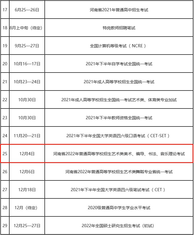 近日,河南省招生办公室公布2021年度招生考试历,其中将于12月4日举行河南省2022年普通高等学校音乐理论考试。