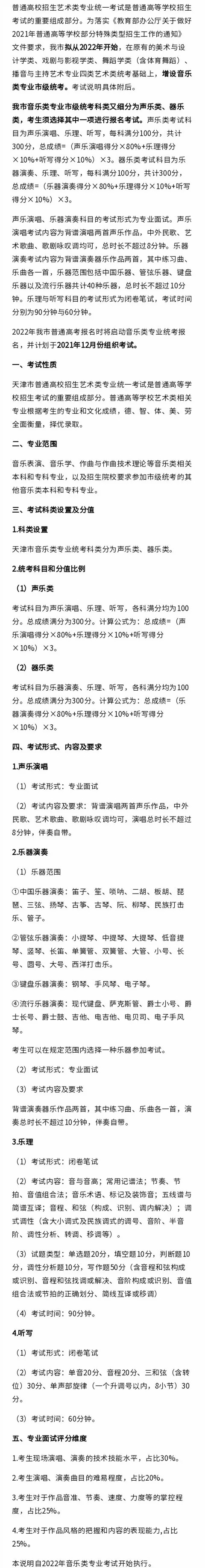 2021年11月3日,天津市教育考试院发布重要提示,从2022年高考报名开始,艺术类专业市级统考将增加音乐类专业。2022年天津市普通高考报名时将启动音乐类专业统考报名,并计划于2021年12月份组织考试。