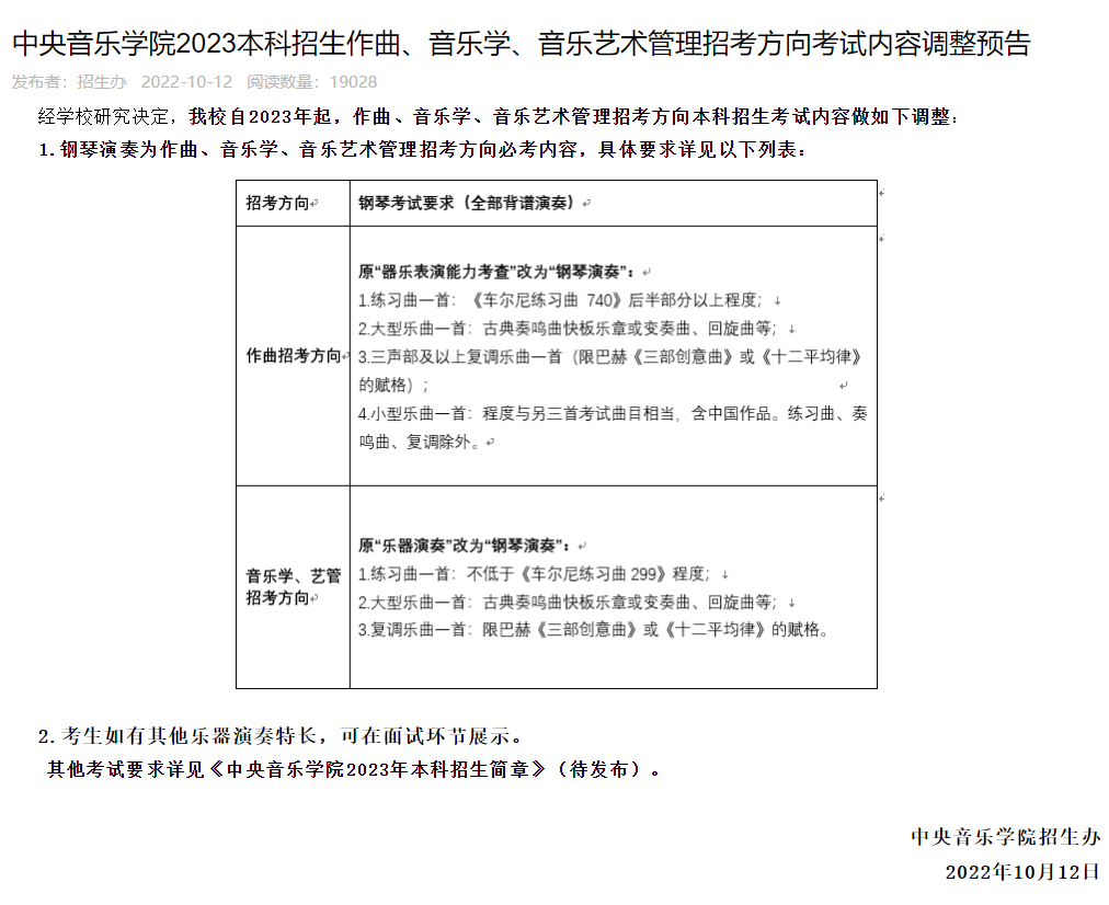 央音早在2022年10月发布的信息表明2023招生:作曲、音乐学、音乐管理由之前的可以选择器乐种类报考,改为必考钢琴。这是央音10年来最大的变动,说是音乐考学界地震级的消息也不为过,很多非钢琴专业考生泪奔。