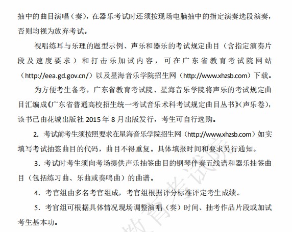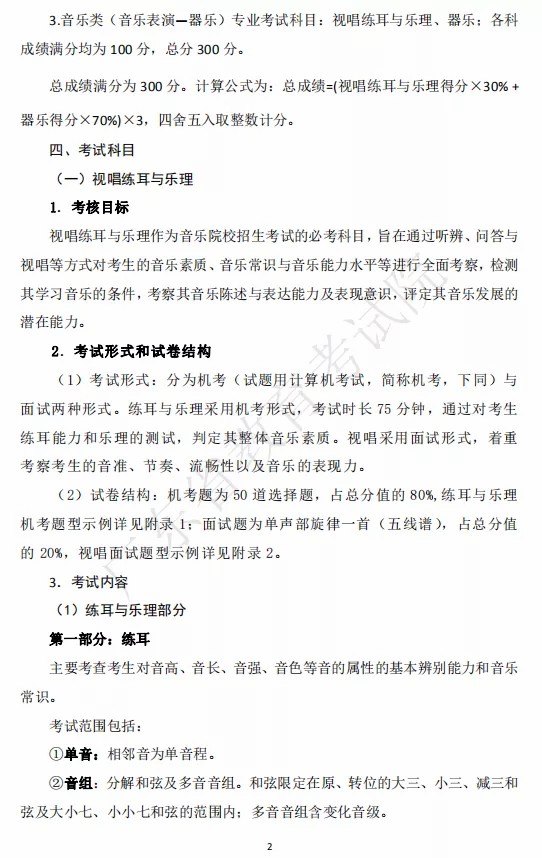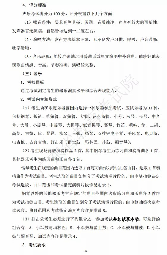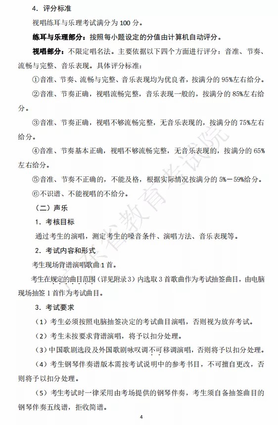 2.考生音乐类省级统考的总成绩=笔试得分+视唱得分+声乐得分+器乐得分,四舍五入取整数计分。