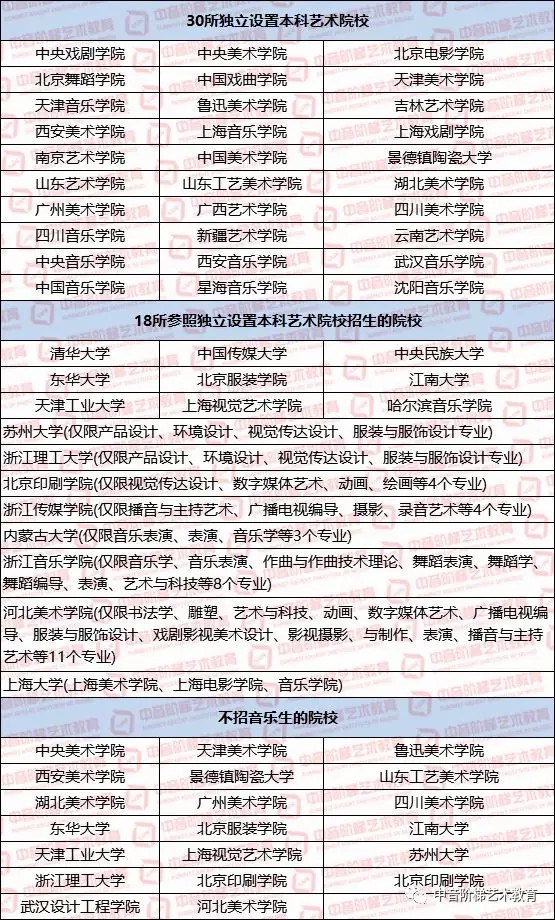 30所独立设置本科艺术院校及18所参照独立设置本科艺术 的院校还会继续组织校考。名单如下: