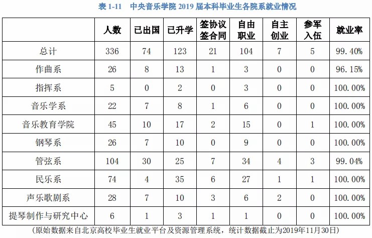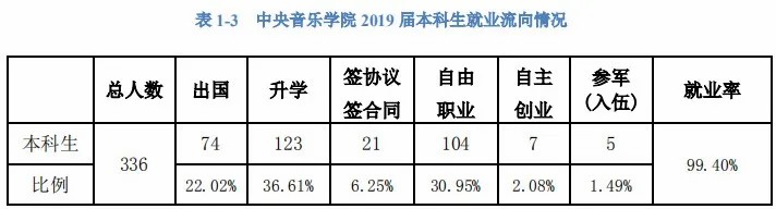 有同学可能疑问为什么没有看到音乐学院上榜,中央音乐学院、中国音乐学院、上海音乐学院等艺术院校的同学,就业情况如何?他们的待遇也是很可观的,出国、考研、在公司就职、自由职业等方向更加多元化,划分到各项样本数量少,招聘机构统计困难,同学们可参看各院校发布的毕业指南。如中央音乐学院: