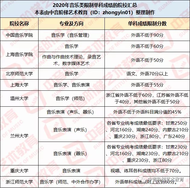 部分院校的音乐专业方向对单科分数有要求:中国音乐学院音乐管理专业外语不能低于90分,上海音乐学院音乐学专业外语不能低于60分,北京师范大学语文、外语要求70分以上...