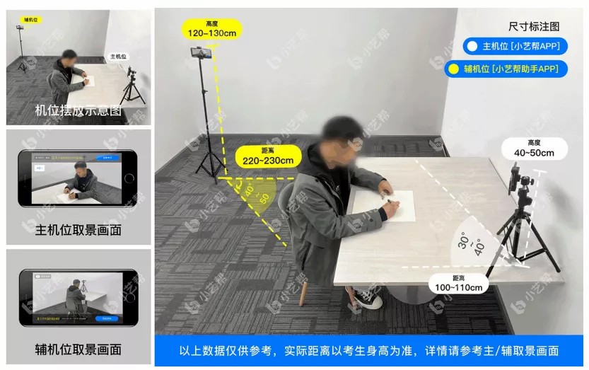 (2)利用两部智能手机分别拍摄。一部手机安装“小艺帮APP”作为主机位,进入考试后系统录制考生考试全程视频;另一部手机安装“小艺帮助手APP”作为辅助机位,架设在可拍摄独立空间全景的位置,拍摄考场环境。单个考试科目结束后,需要先提交主机位视频,然后暂停辅助机位录制,等全部考试科目都提交后才能提交辅助机位。(详细操作指南见附件1)