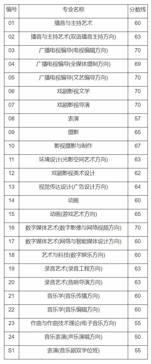 中国传媒大学2021艺术类初试合格分数线