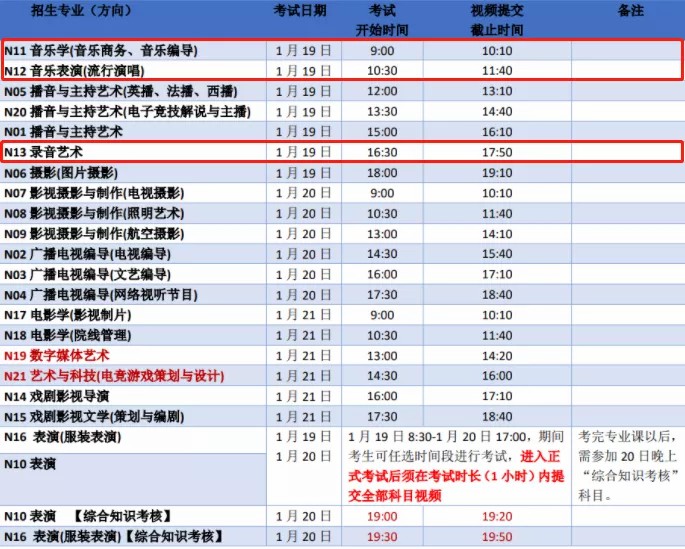 2.表演、表演(服装表演)两个专业,考试分两部分进行。考试科目1【综合知识考核】必须在指定时间内参加并完成。另外4个考试科目可在两天的考试时间安排内任选时段(1小时内)完成。具体见表格安排。