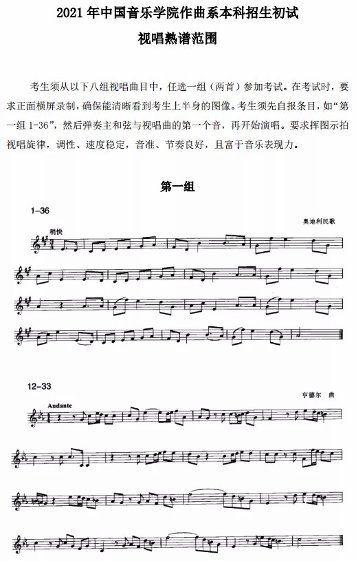 中国音乐学院2021年作曲系初试视唱熟谱范围