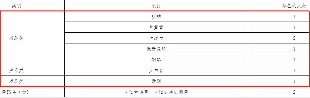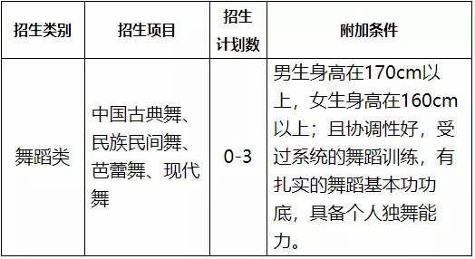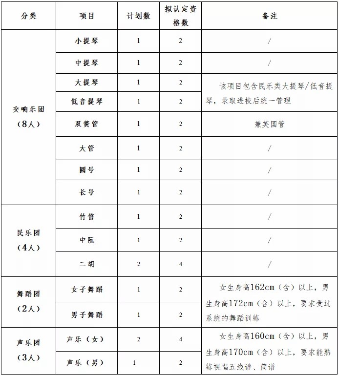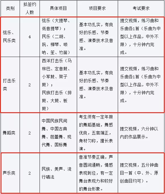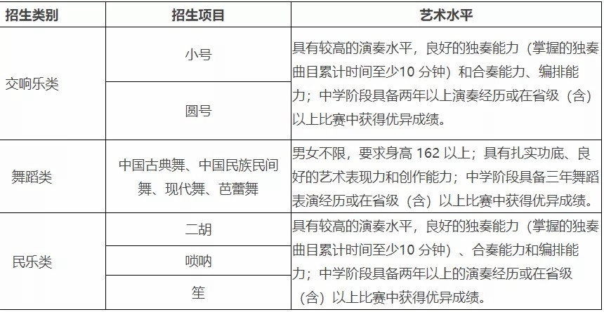 管弦乐类:受过系统的专业训练,有较强的识谱能力(五线谱)。民乐类:受过系统的专业训练,有较强的识谱能力(简谱)。舞蹈类:男生身高175cm(含)以上,女生身高162cm(含)以上,协调能力好。表演类考生:男生173cm(含)以上,语言能力佳、表演能力强。