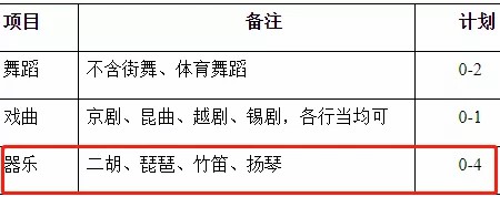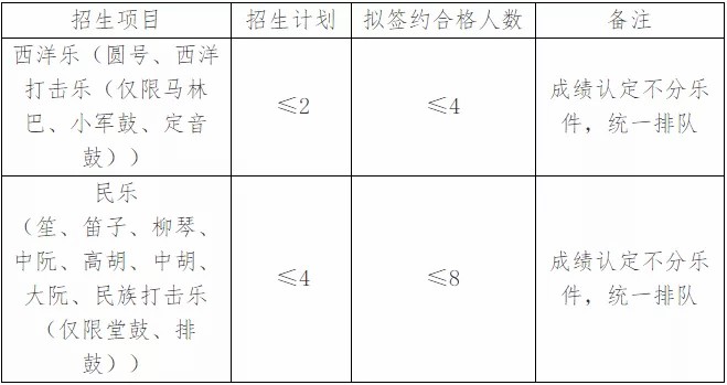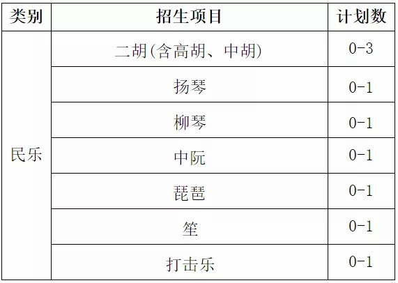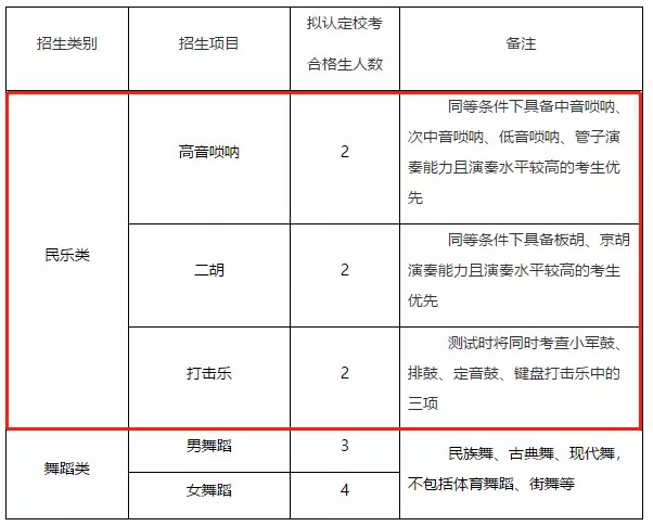 1、民乐类:具有乐器特长(乐器种类详见后文“招生计划”),获得社会业余考级;在高中阶段具有参加民乐团的经历,个人或集体至少取得下述成绩之一:参加比赛获奖、参加省级比赛获得二等奖及以上、参加地市级比赛获得一等奖及以上。