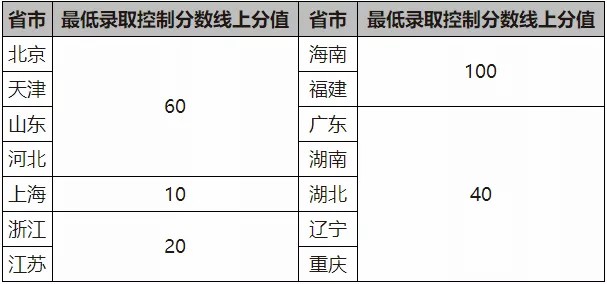 高考综合改革省份:上海考生高考成绩须达到相关较低录取控制参考分数线上15分(含);浙江考生高考成绩须达到相关较低录取控制参考分数线上30分(含);北京、天津、山东、江苏、广东考生高考成绩须达到相关较低录取控制参考分数线上60分(含);海南、福建、湖北、重庆考生高考成绩须达到相关较低录取控制参考分数线上90分(含);湖南、河北、辽宁考生高考成绩须达到相关较低录取控制参考分数线上100分(含)。