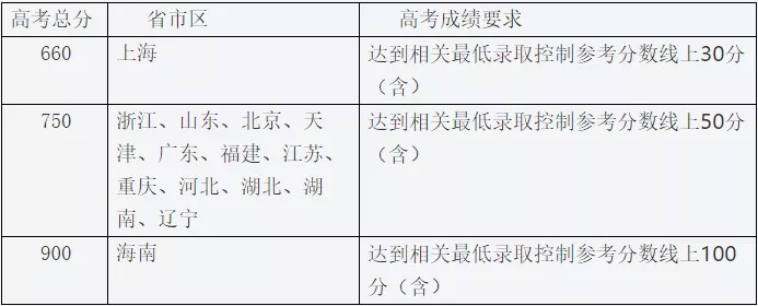 (二)高考综合改革省市北京、天津、河北、辽宁、江苏、浙江、福建、山东、湖北、湖南、广东、重庆等,考生高考成绩须达到该省市规定的相应较低控制分数线上70分;(三)高考综合改革省市上海,考生高考成绩须达到自主招生控制线上50分;(四)高考综合改革省市海南,考生高考成绩须达到规定的相应较低控制分数线上160分。