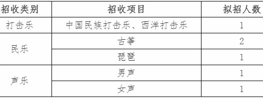 招生项目:美声唱法(女高音)、话剧表演(男女不限)、舞蹈团招收1名:古典舞及民族民间舞(男女不限,不招芭蕾、体育舞蹈、街舞)、笛子、中提琴、定音鼓