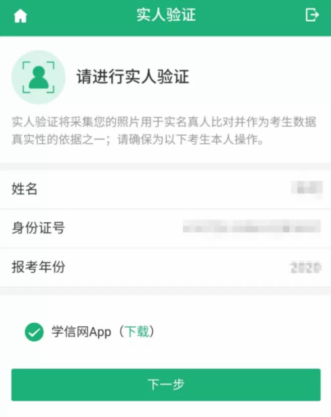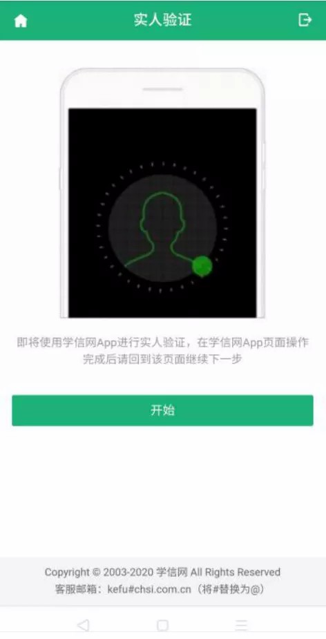 若考生从移动设备登录系统,则选择“学信网App”方式后,在移动设备页面点击【开始】,按照提示进行实人验证操作,完成后点击“返回首页”回到原操作的浏览器进行后续操作。