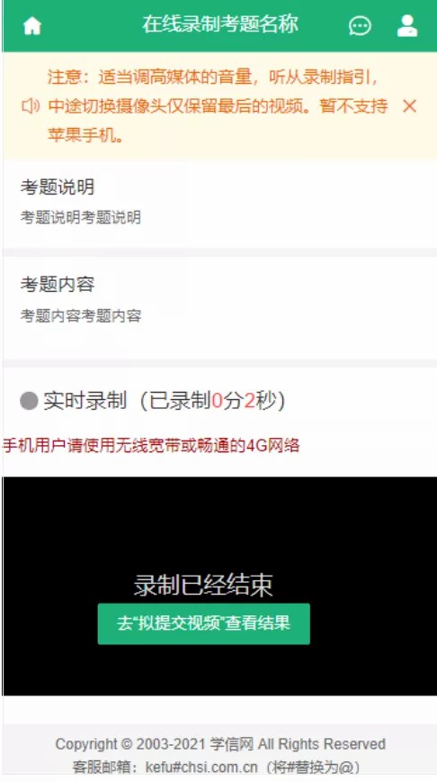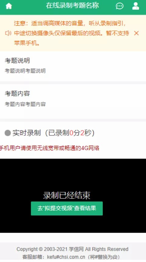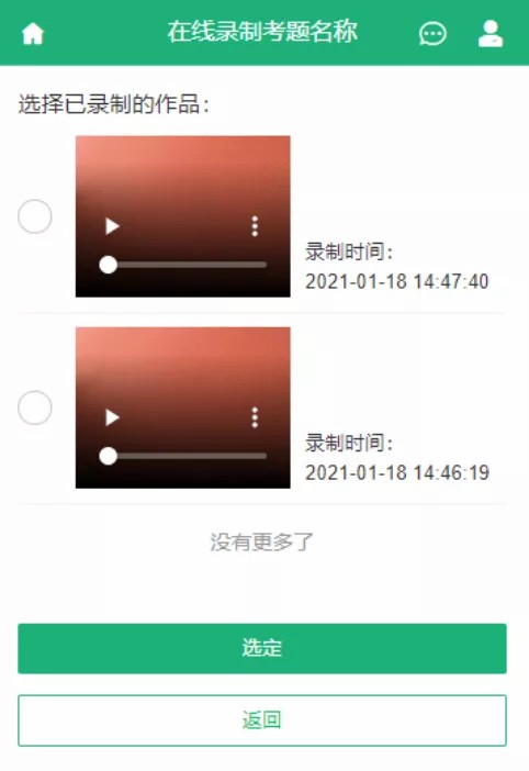 对于限单次录制的,考生录制完成后系统自动提交。对于允许多次录制的,考生录制完成后可以选择提交或重录,较终考生须从已录制好的视频中选择一个进行手动提交。同一个的所有视频、文字等材料提交后,方可提交完成;同一场考试的所有提交后,该考试方可提交完成,表示考试结束。