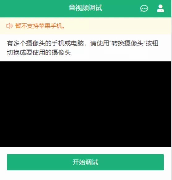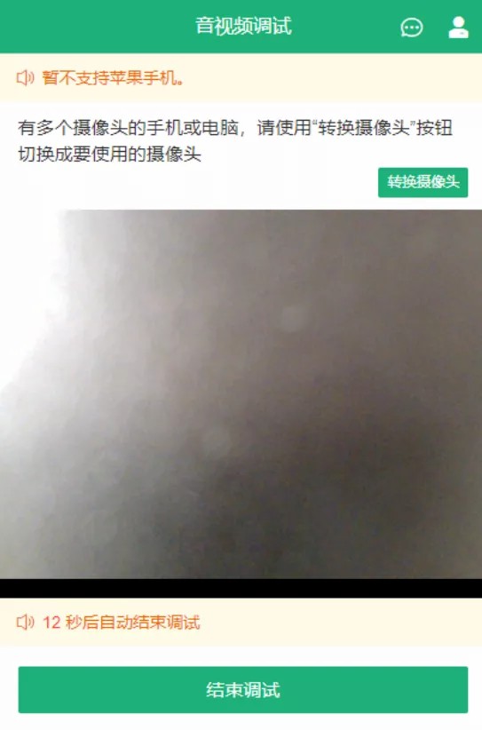 进入调试界面后,点击【开始调试】查看是否可显示图像,点击右上角的【转换摄像头】可转换摄像头,若设备仅有一个摄像头则不可切换。调试设备的摄像头无异常后,点击【结束调试】可在当前页面回看音视频,再点击【下一步】回到选择考试界面。