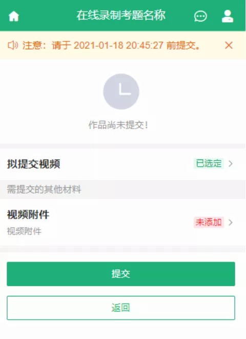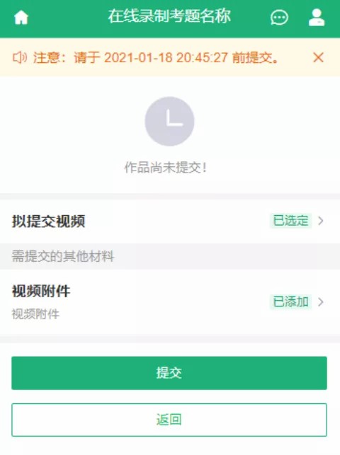 正式录制,即为正式考试。具体的操作流程与排练类似,与排练不同的是,正式录制完成的视频可以作为作品上传系统并提交给高校。正式录制的视频是否可以回看由高校设置。如高校要求考生提供录制视频之外的材料(视频、音频、图片、文字等),考生也须在规定时间内填写并提交。