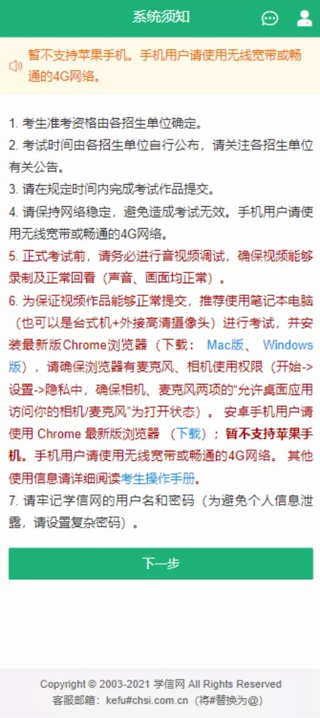 A:请不要使用微信等直接访问系统。安卓手机用户请使用 Chrome 较新版浏览器输入考试网址操作,并下载较新版学信网APP;暂不支持苹果手机。