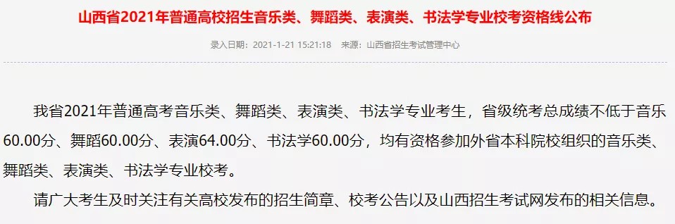 我省2021年普通高等学校艺术类专业课省级统考工作于1月12日全部结束,按照和我省有关文件要求,经省招委会研究,现将我省2021年普通高考艺术类省级统考合格分数线(校考资格线)予以公布: