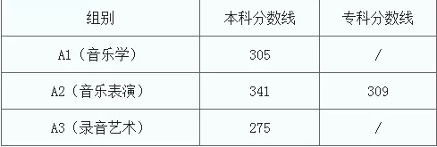 音乐学、音乐表演专业统考合格分数线为170分,音乐基础课笔试合格分数线为45分;舞蹈表演、舞蹈学、舞蹈编导专业统考合格分数线为185分。按四舍五入原则,合格分数线下0.5分以内的考生成绩认定为合格。考生专业统考成绩小数点后保留1位小数。