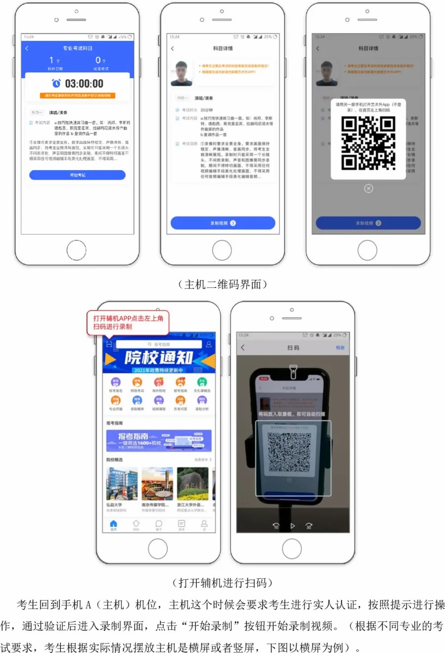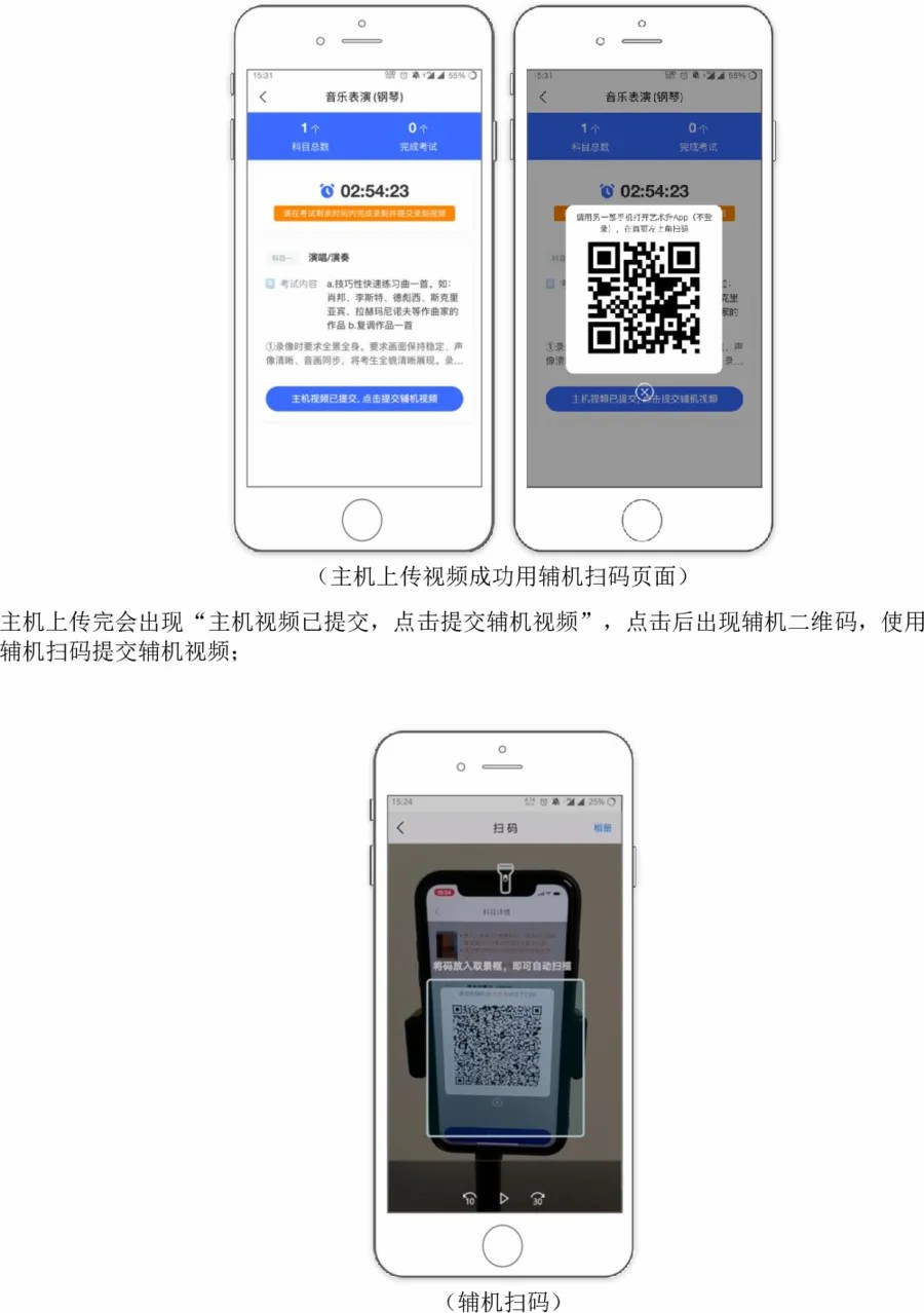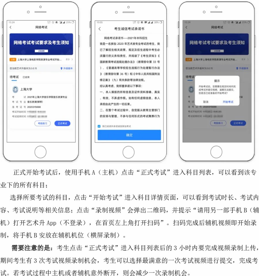2.考生需要准备两部智能手机,双机位拍摄录制,手机A(登录艺术升APP)作为主机,用于网络考试全部内容和流程,手机B(打开艺术升APP无需登录)作为辅机,用于监考考试过程,两部手机都需要下载艺术升APP。(具体机位摆放要求详见《上海大学音乐学院2021年音乐表演专业(初试)线上考试操作流程》)。考试前务必保持两部手机的电量和内存充足,内存建议至少在20G以上,提前检查WiFi网络信号,网络稳定畅通。务必移除两部手机的SIM卡,没有通话功能,考试过程中如果接到来电,会直接中断录制;除此之外,外放音乐、闹钟等其他应用程序也注意关闭,避免外界干扰。考试结束后,“主机位”和“辅机位”录制的视频必须全部提交,否则考试无效。