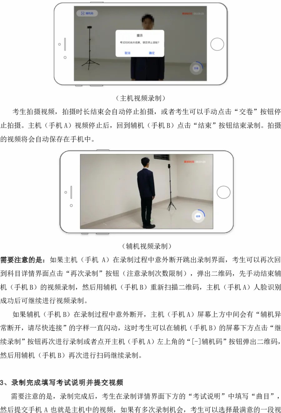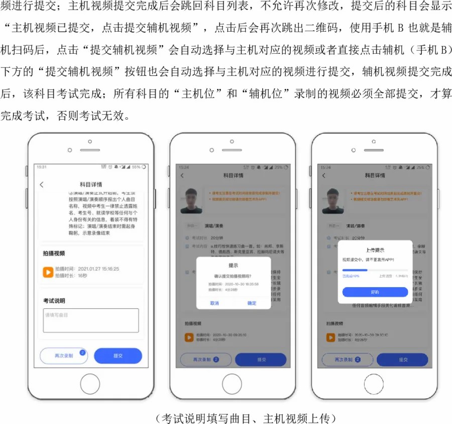 5.考试视频中只允许出现考生本人,不得出现任何其他人员(声乐演唱专业钢琴或音频伴奏除外),声音和图像需同步录制,期间不得转切画面,不得采用任何视频编辑手段美化处理画面,不得采用任何音频编辑手段美化编辑音频,只能使用考试软件自带拍摄功能。违反者将被视为违规并取消考试资格。录像时要求全景全身。要求画面保持稳定、声像清晰、音画同步,将考生全貌清晰展现。