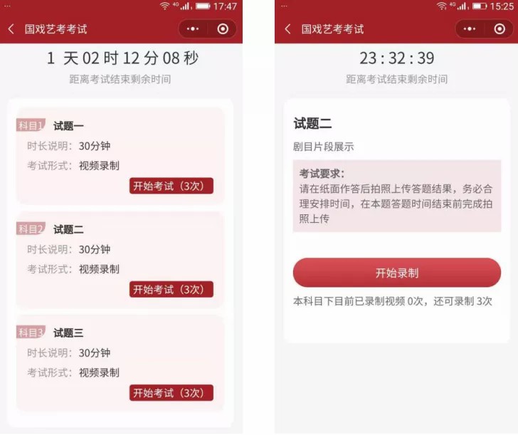 2.视频录制与上传起止时间为2021年2月16日-2月21日(每天9:00-21:00),操作方法与一试相同,参见《中国戏曲学院2021年本科招生线上考试(视频提交)操作指南》。未在规定时间内完成上传视频的考生,将被视为自动放弃考试资格。