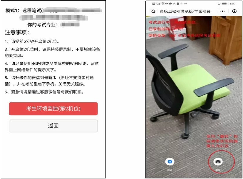 设备:考生需准备两台装有微信的手机设备,并登录不同的微信账号。 其中一台为考试主机,另一台为监考机。