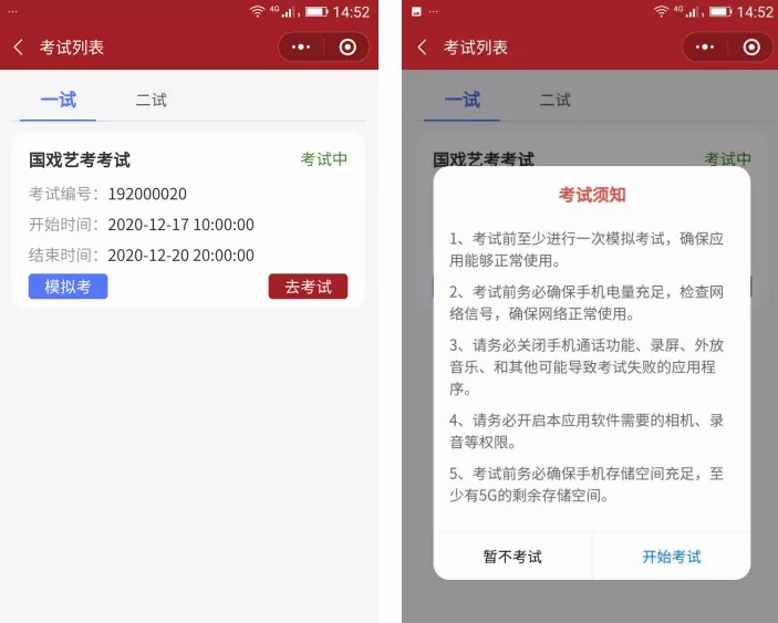 在考试列表查看考试信息。正式考前需要进行,熟悉考试流程,模拟考与正式考流程一致,保障正式考试顺利进行。点击“模拟考”进入流程。