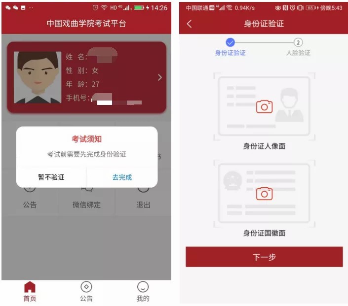 2.两台手机均需输入本人的身份证号码和姓名进行登录,并根据页面要求进行拍照,核验身份。