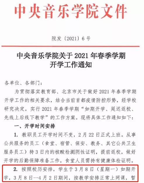 近日,中央音乐学院发布2021春季开学通知,在校生3月8日-4月2日期间正常上网课,4月以后返校。按照校考日程来看,这一安排或许是为了与来央音参加春节后现场校考的2021届音乐生错开,减少聚集。