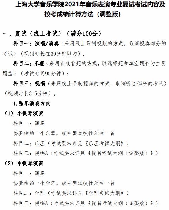 调整后的复试考试内容及校考成绩计算方法,见附件2《上海大学音乐学院2021年音乐表演专业复试考试内容及校考成绩计算方法(调整版)》)。