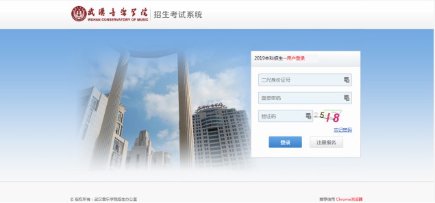 1、系统登录。在浏览器地址栏输入武汉音乐学院招生信息网(网址:http://zsks.whcm.edu.cn/),打开“武汉音乐学院招生考试系统”,输入用户名、密码和验证码进行用户登录,如图所示: