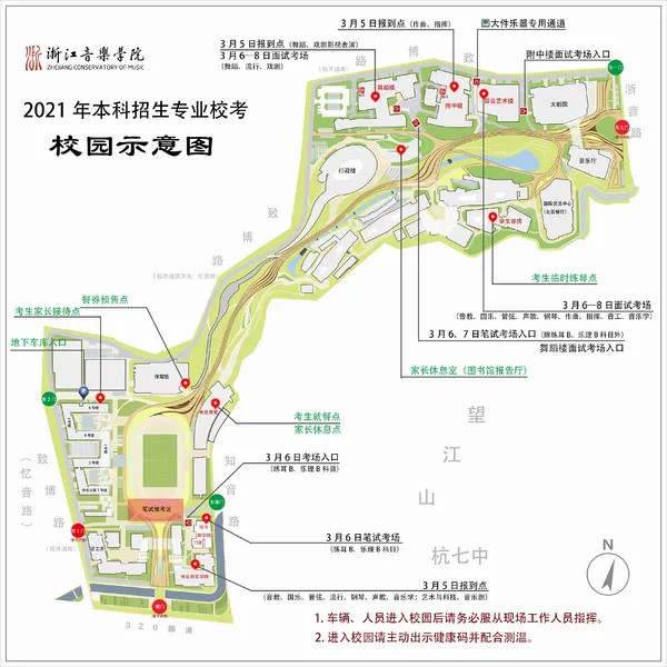6.请考生提前一天熟悉校园环境及考试区域,以免误考。如需自驾车辆进入,请听从指挥,将车辆停放地下车库,临时接送车辆即停即走;学校周边因地铁建设,交通路况复杂,请考生及时了解杭州市区车辆限行规定,选择合适的交通工具提前出行。3月5日—8日,学院开放东1门、西2门、东南门,每天早上6:15后考生、家长方可进入校园,其中6日上午在附中楼参加笔试考试的考生,请选择导航从浙音路“浙江音乐学院东1门”进入校园;在南区综合教学楼15B参加笔试考试的考生,请选择导航从致博路(忆音路)“浙江音乐学院西2门”进入校园。如乘坐地铁6号线到浙江音乐学院站,可从知音路“浙江音乐学院东南门”进入校园。