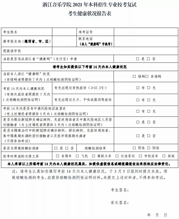 (3)考生须根据我院发布的《浙江音乐学院2021年本科艺术类招生专业与各省统考子科类对照表》,提供所报专业对应的所在省相关专业统考(联考)合格证或成绩单原件及复印件。如考生生源地所在省尚未组织考试或尚未公布成绩而无法取得合格证的,需考生本人签署情况说明。
