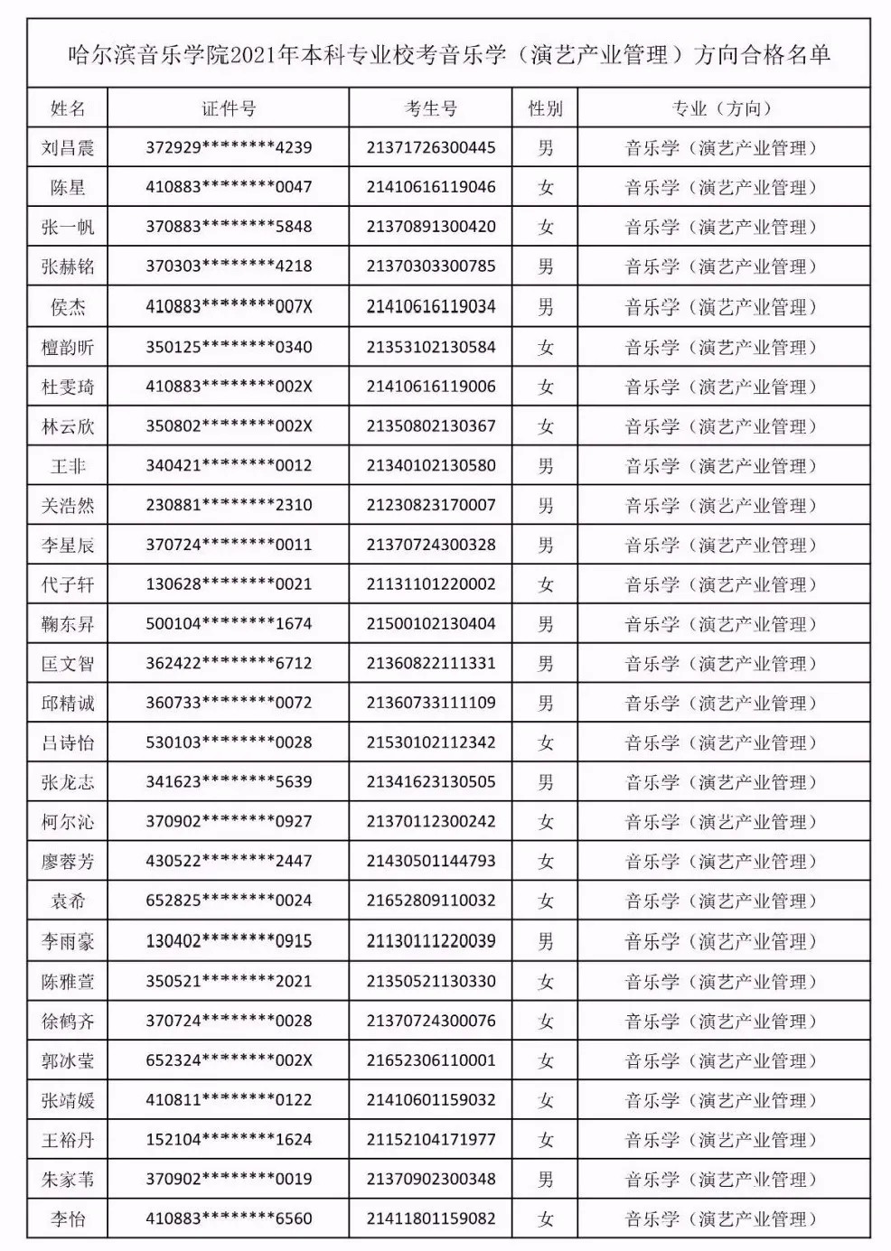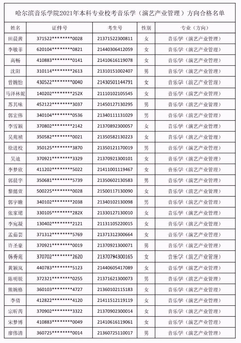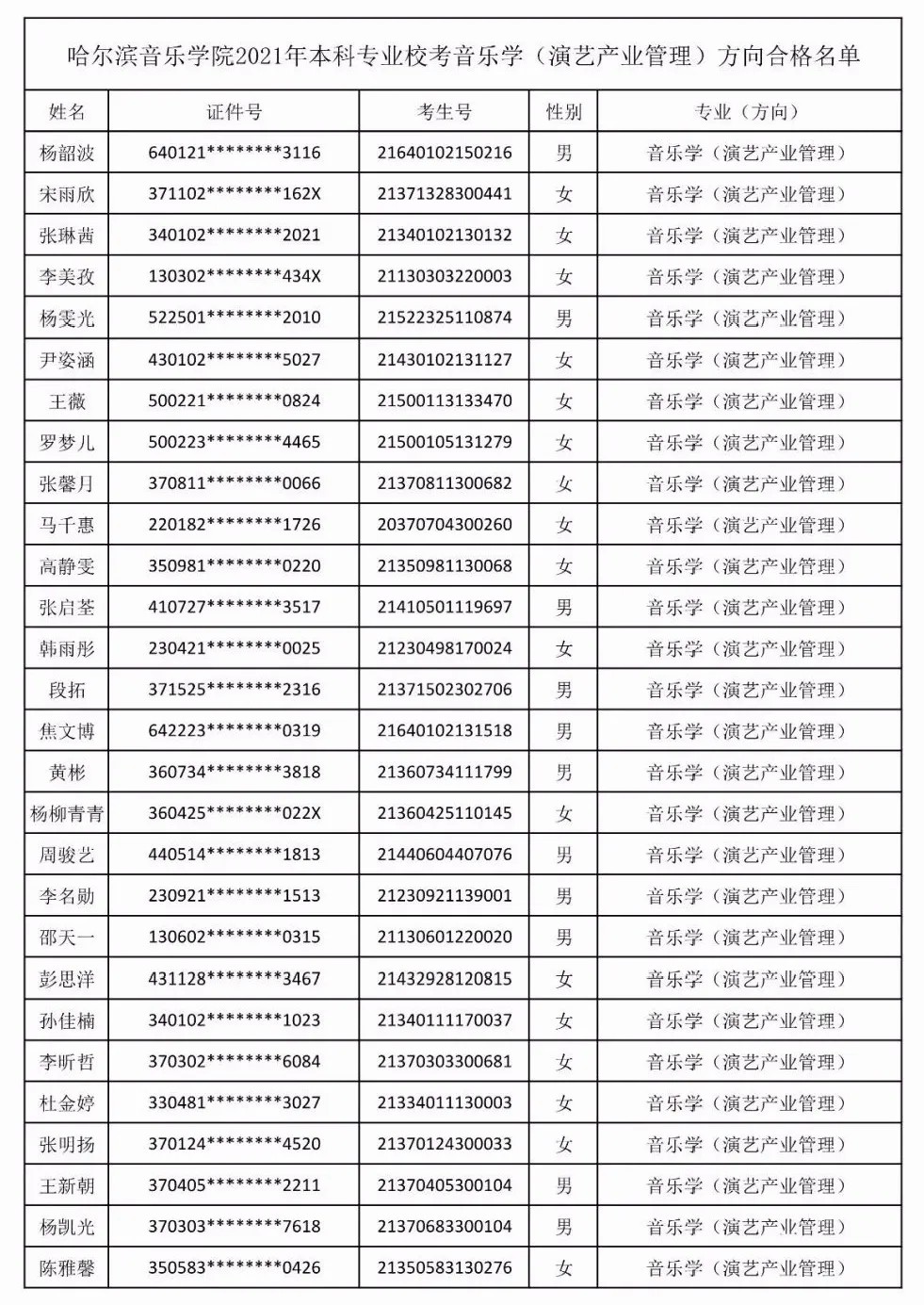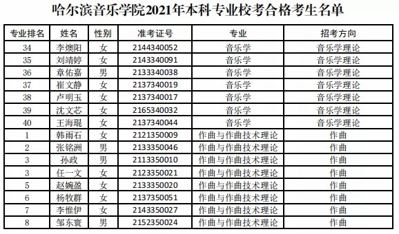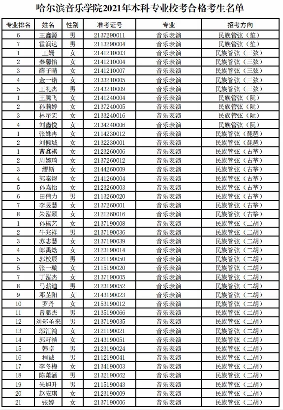 根据《哈尔滨音乐学院2021年本科招生简章》要求,按照学院2021年本科专业校考相关规定,经招生领导小组研究决定,现将哈尔滨音乐学院2021年本科招生专业校考合格考生名单公示如下(见附件),公示期5天,自2021年4月9日至4月13日。音乐学专业(演艺产业管理方向)合格名单已于2021年2月4日在我院官方网站公布,本次不再重复。