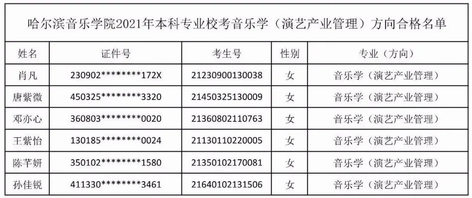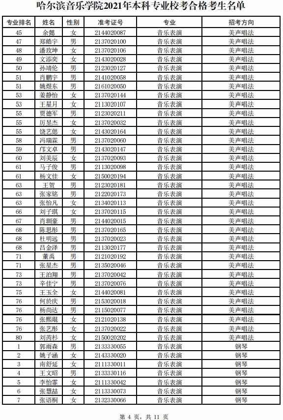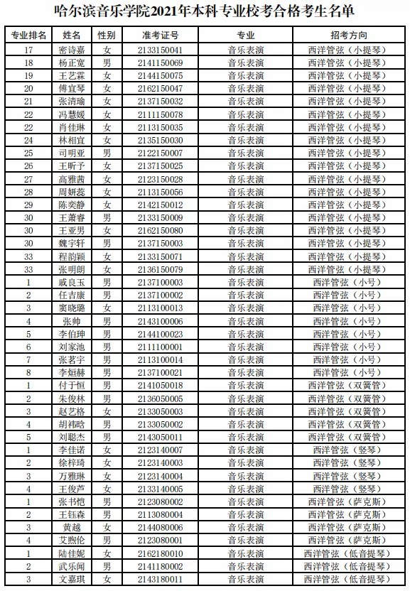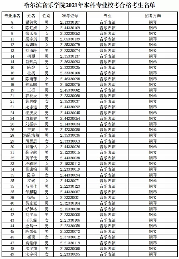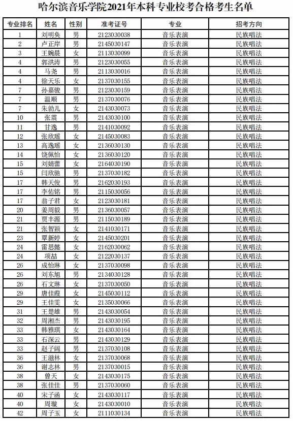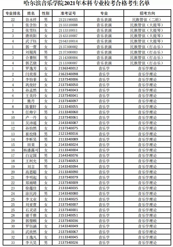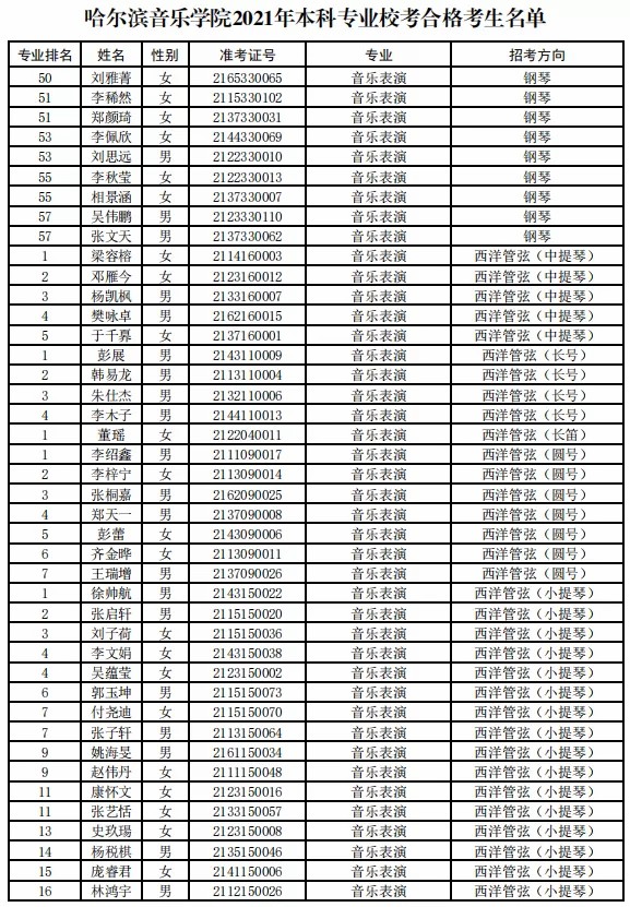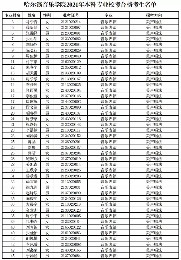 根据《哈尔滨音乐学院2021年本科招生简章》要求,按照学院2021年本科专业校考相关规定,经招生领导小组研究决定,现将哈尔滨音乐学院2021年本科招生专业校考合格考生名单公示如下(见附件),公示期5天,自2021年4月9日至4月13日。音乐学专业(演艺产业管理方向)合格名单已于2021年2月4日在我院官方网站公布,本次不再重复。
