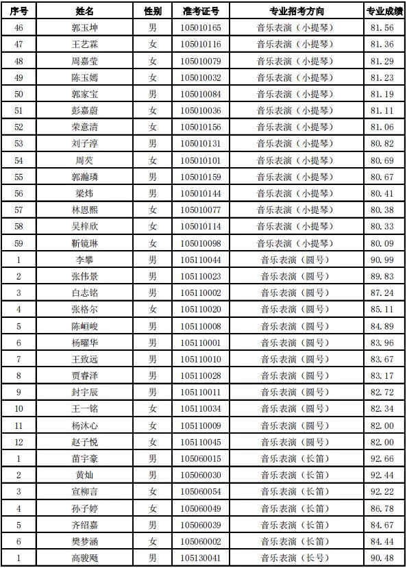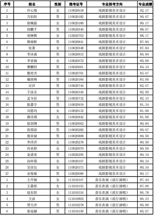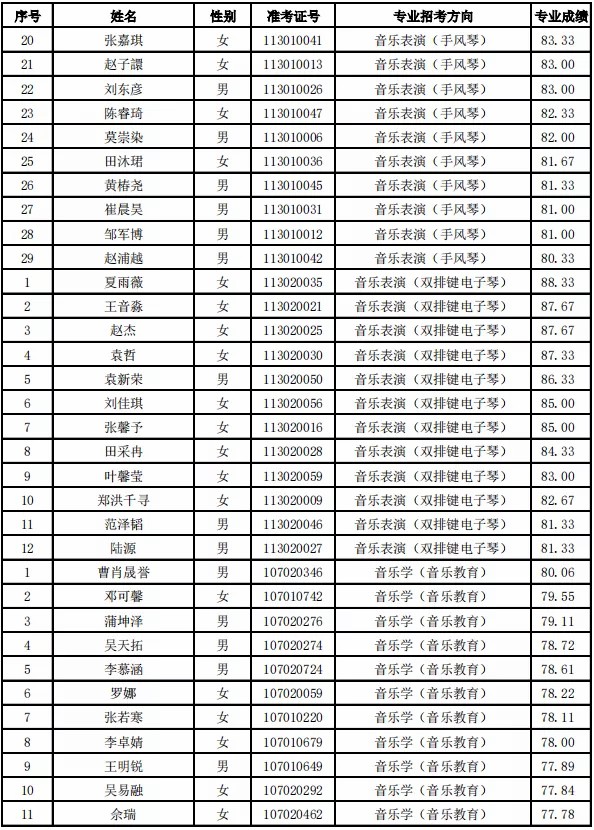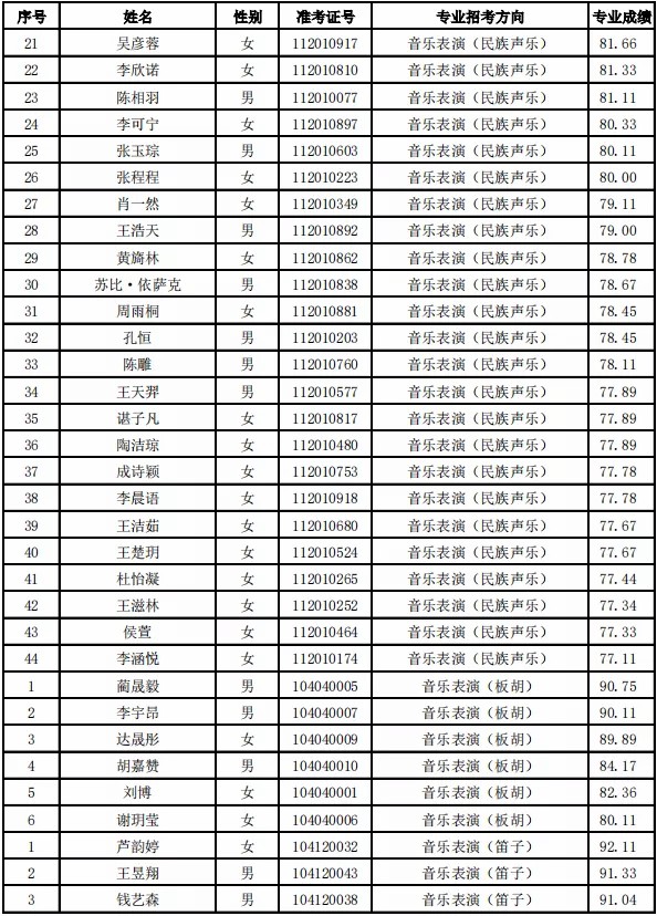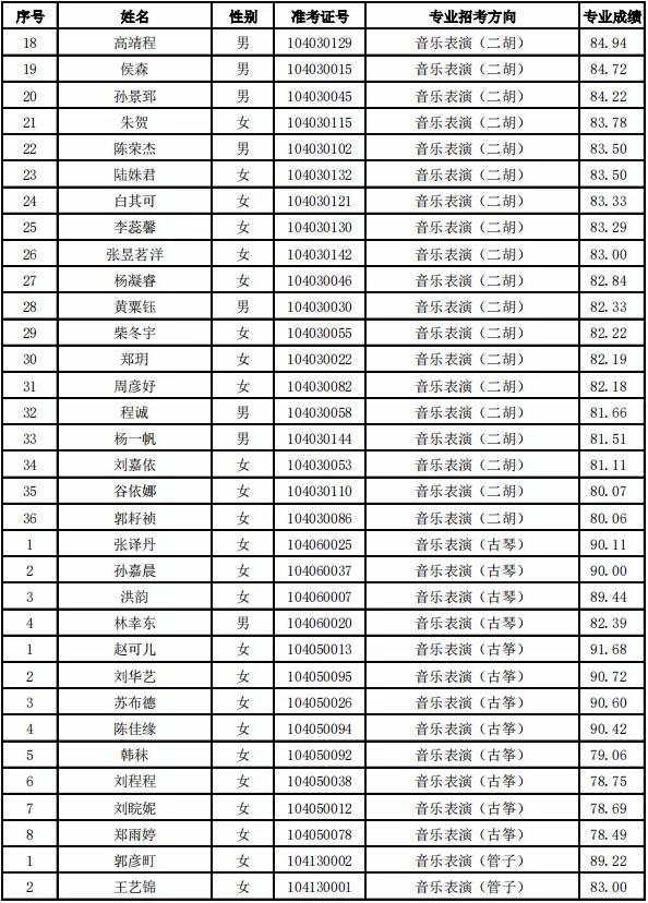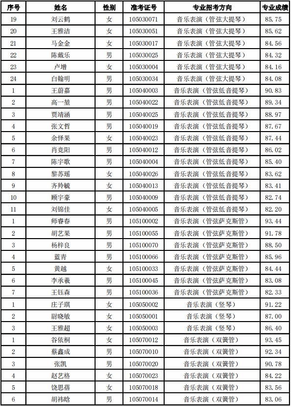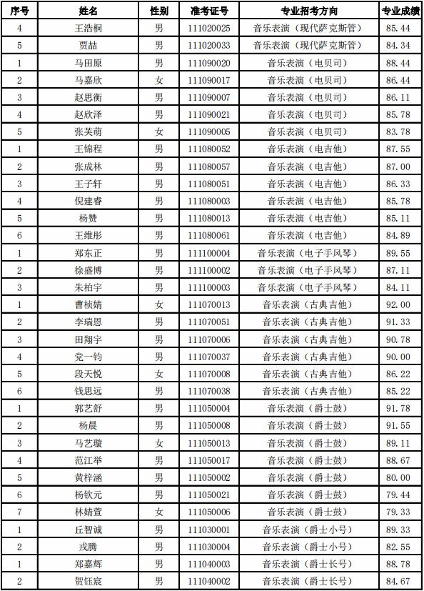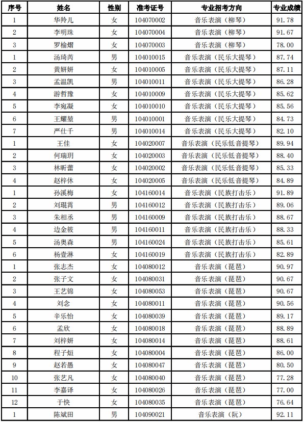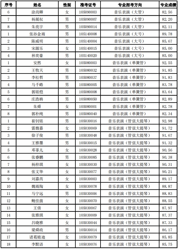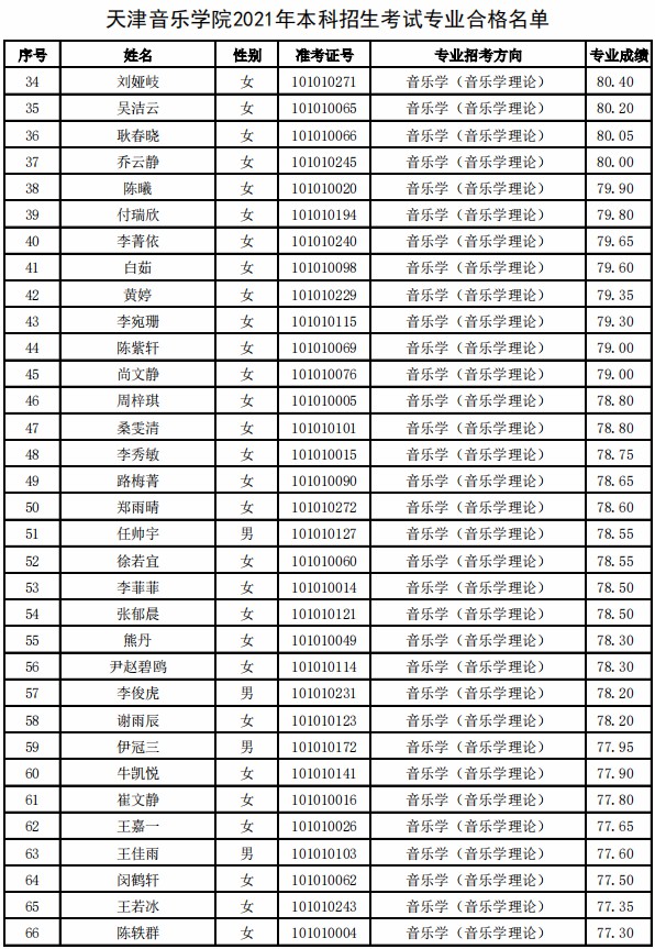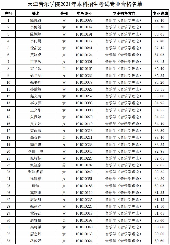天津音乐学院2021年本科专业合格名单