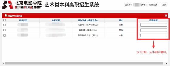 特别提示:此专业志愿顺序是供考生同时可能被多专业(招考方向)录取时参考,请考生按照自己的真实意愿填报,一经填报不得修改。例如,排在专业志愿的专业(招考方向)不能被录取时,将顺延至第二、第三专业志愿顺序。如遇考生在【招生系统】内填写的专业志愿顺序与高考填报的专业志愿顺序不同时,以考生填报的高考专业志愿顺序为准。