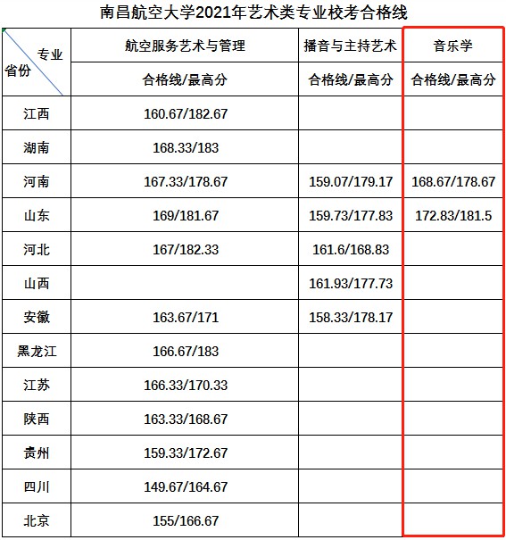 南昌航空大学2021年艺术类专业校考成绩现已公布,现将各专业合格线公示(详见下表),考生可在我校招生信息网(http://zjw.nchu.edu.cn/default.php) 或微信小程序关注“南昌航空大学招办”点“艺术类校考成绩查询”窗口内输入姓名、身份证号进行成绩查询。我校艺术类分省分专业招生计划需待各省级招办审核通过后公布。