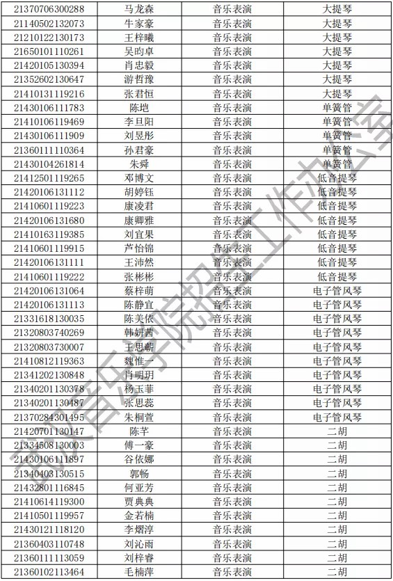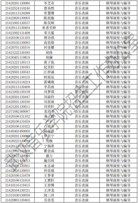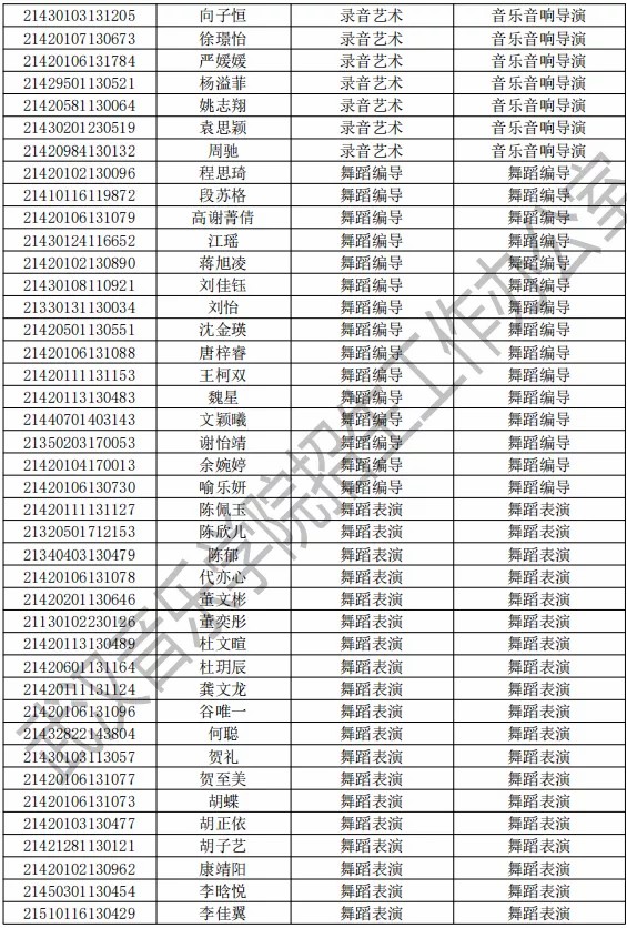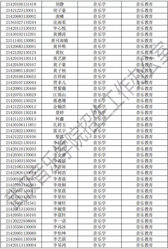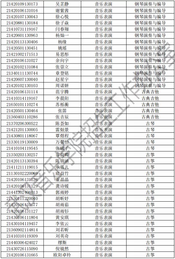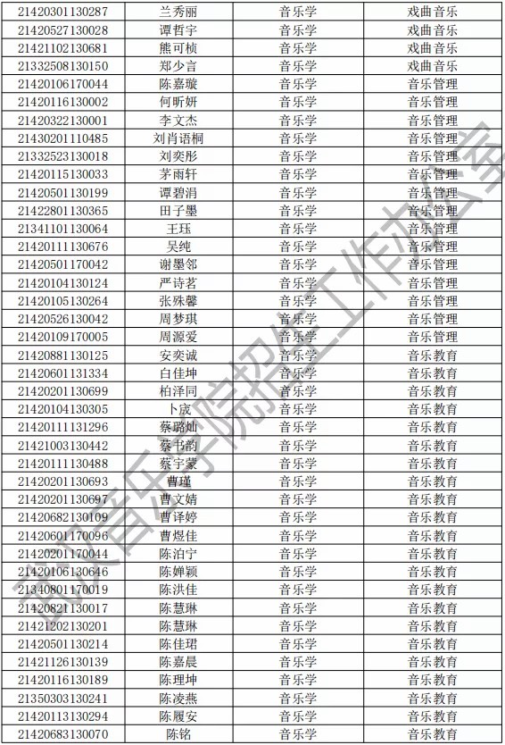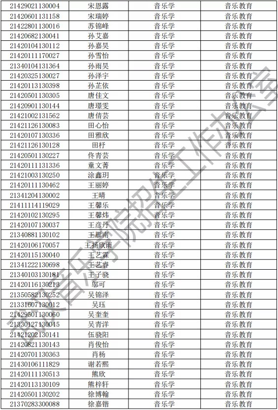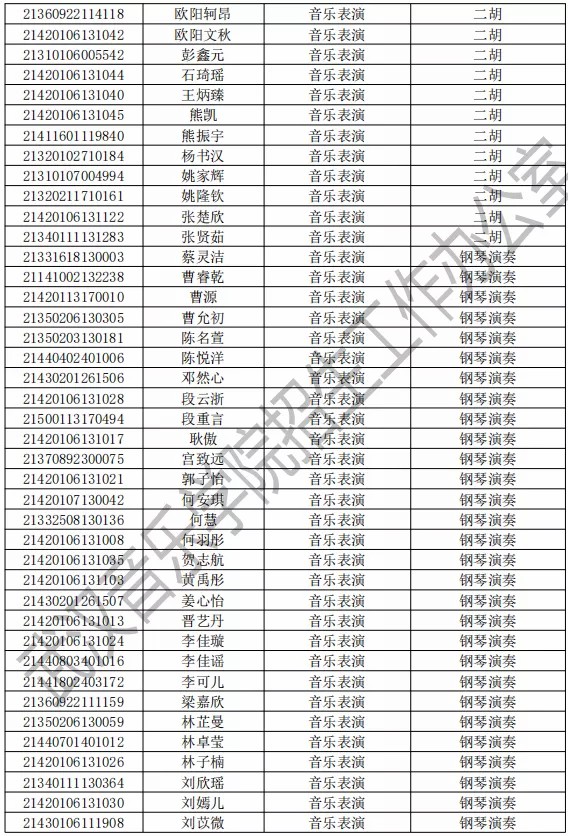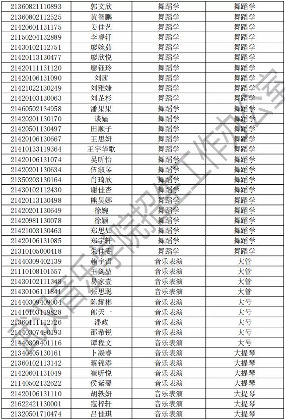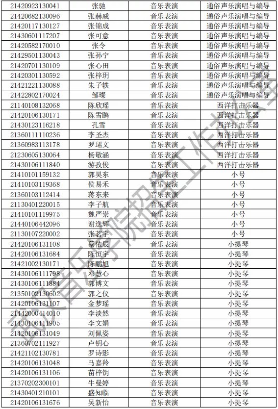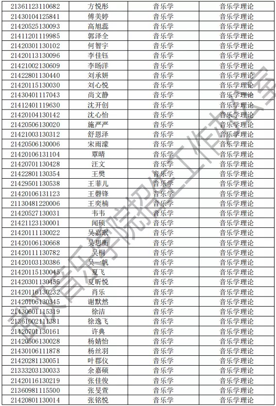 武汉音乐学院2021年本科专业拟录取名单