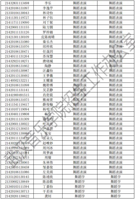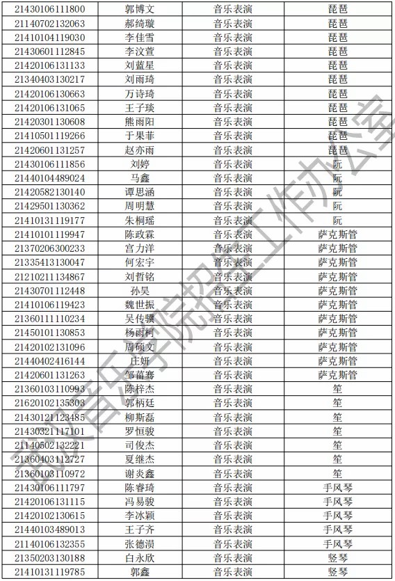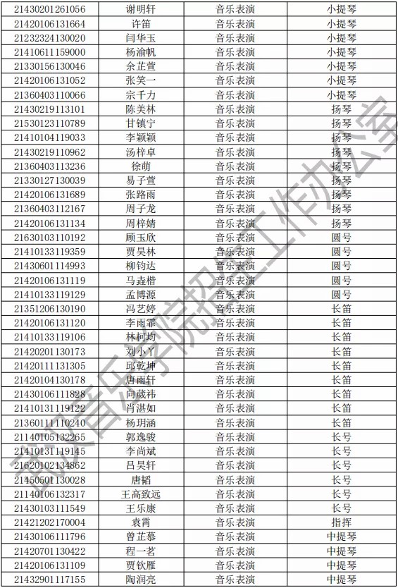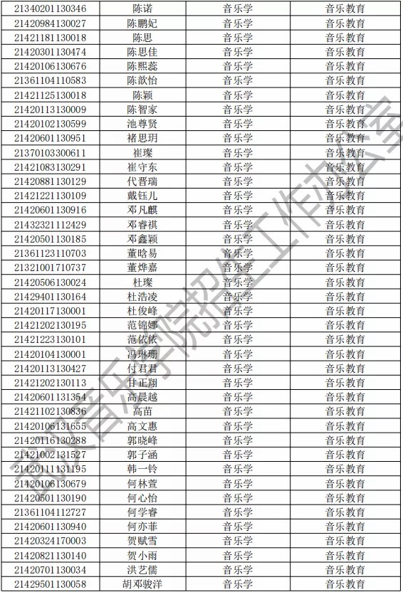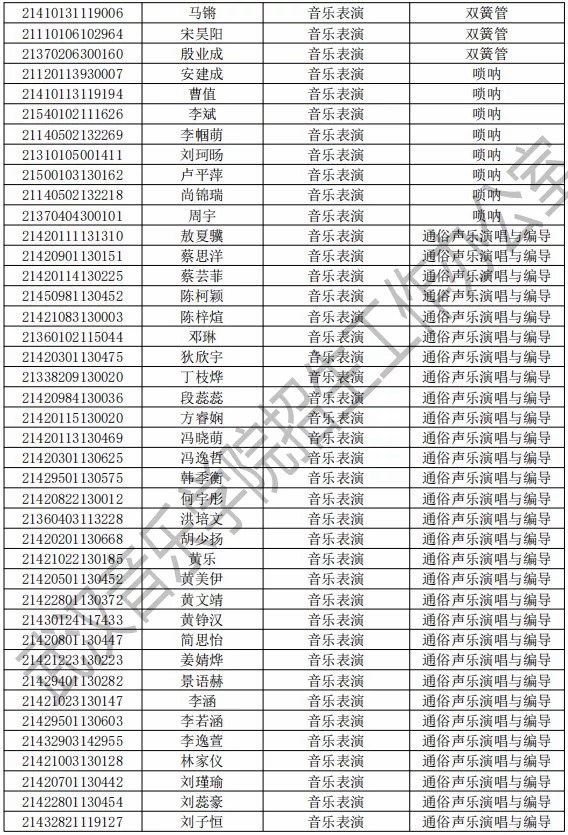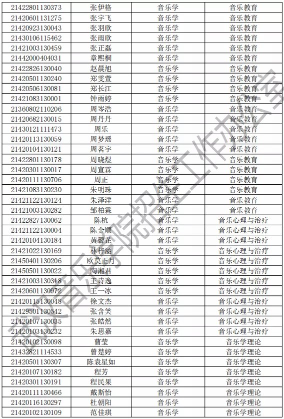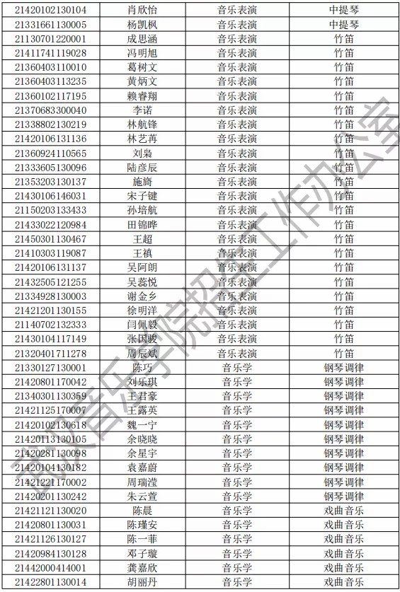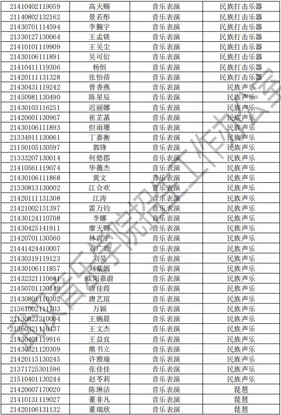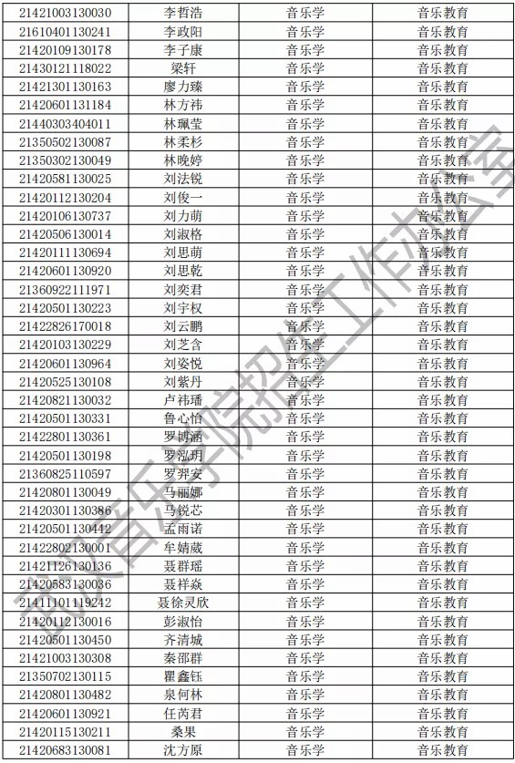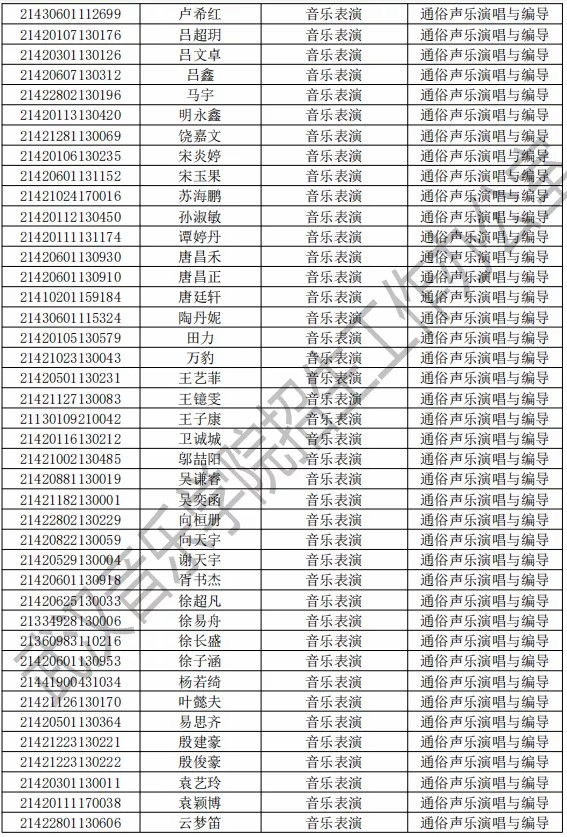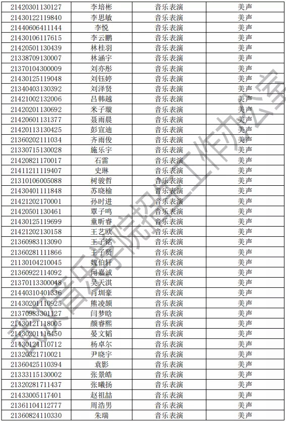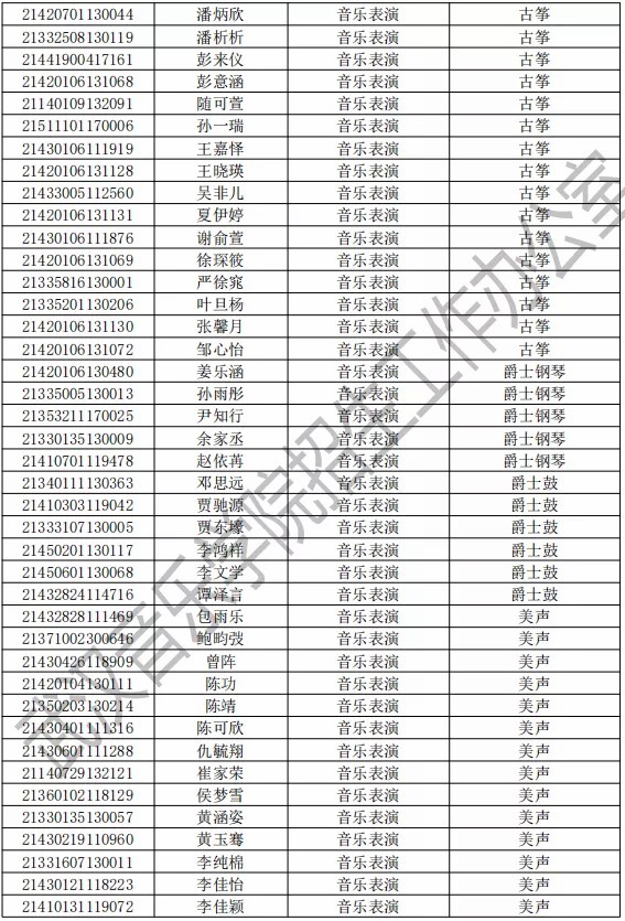 武汉音乐学院2021年本科专业拟录取名单