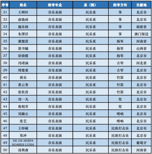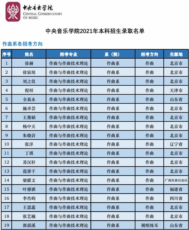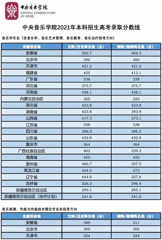 中央音乐学院2021年本科文化录取分数线及名单公布