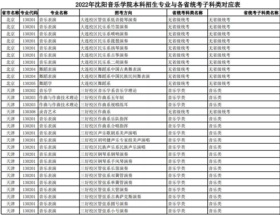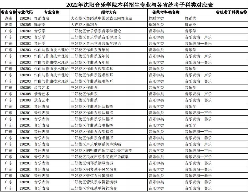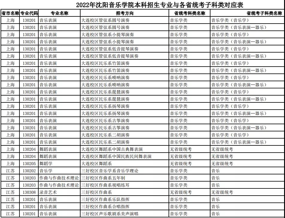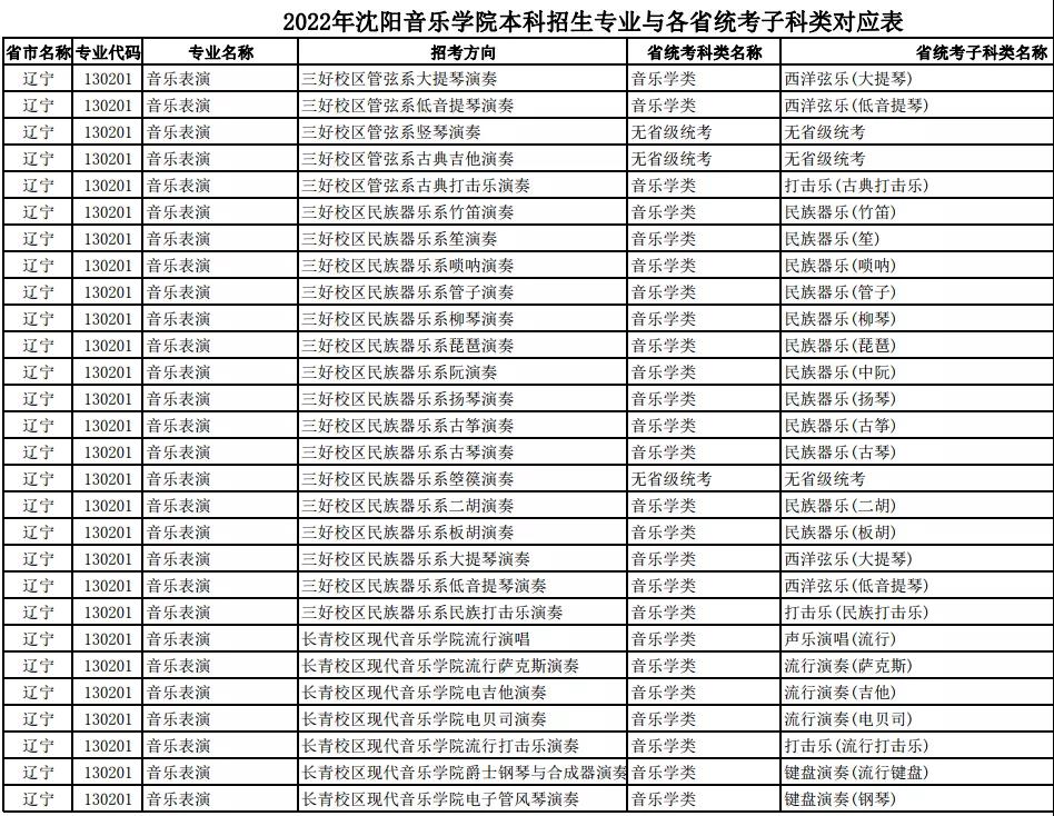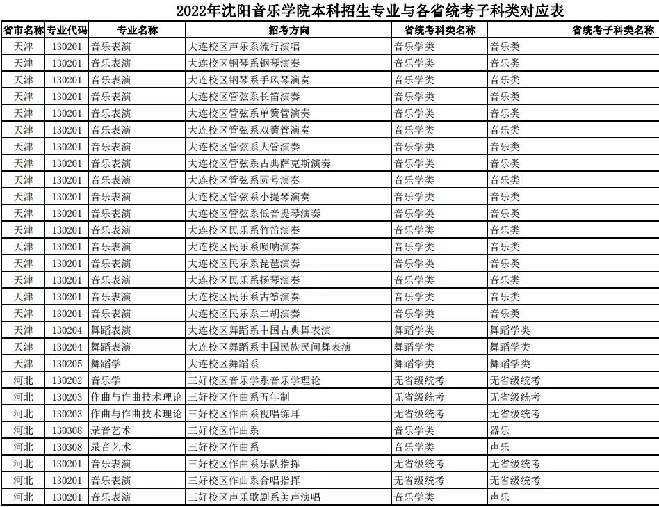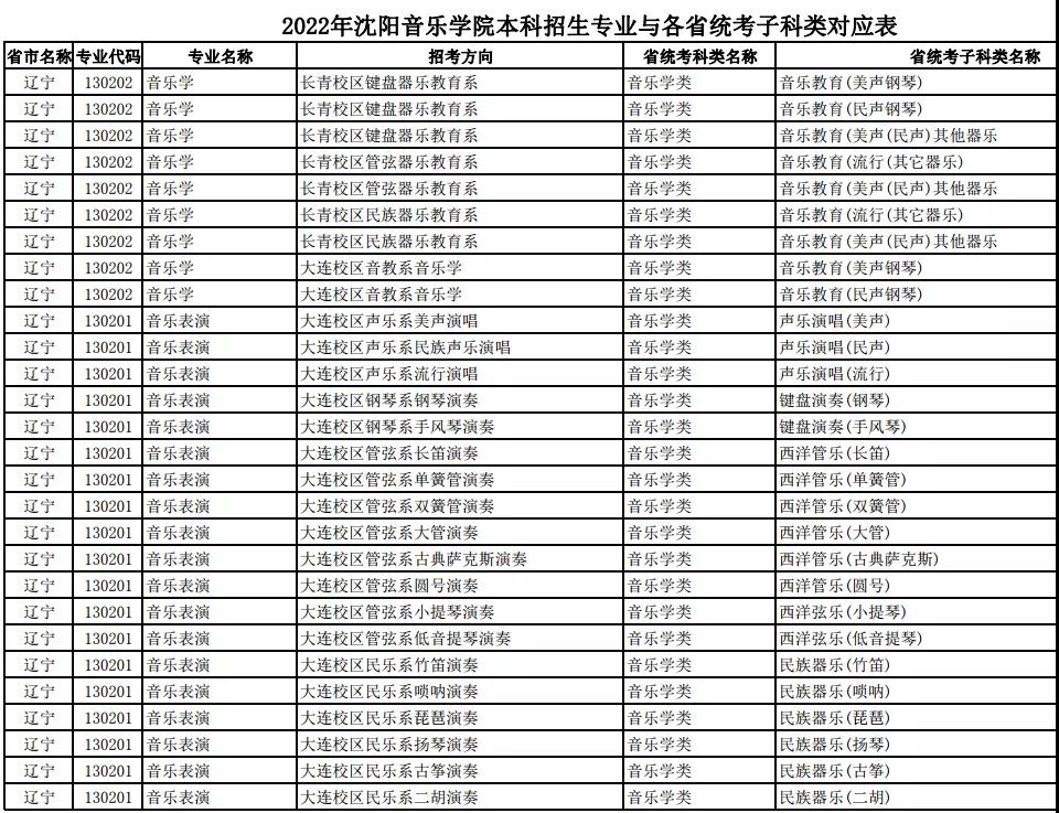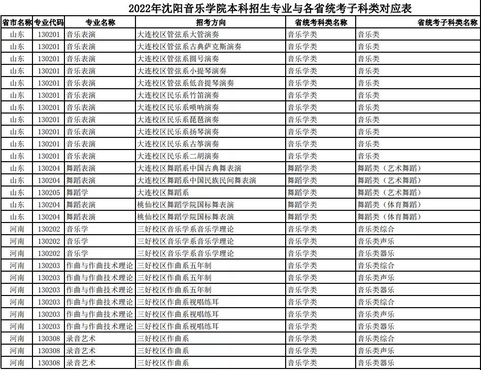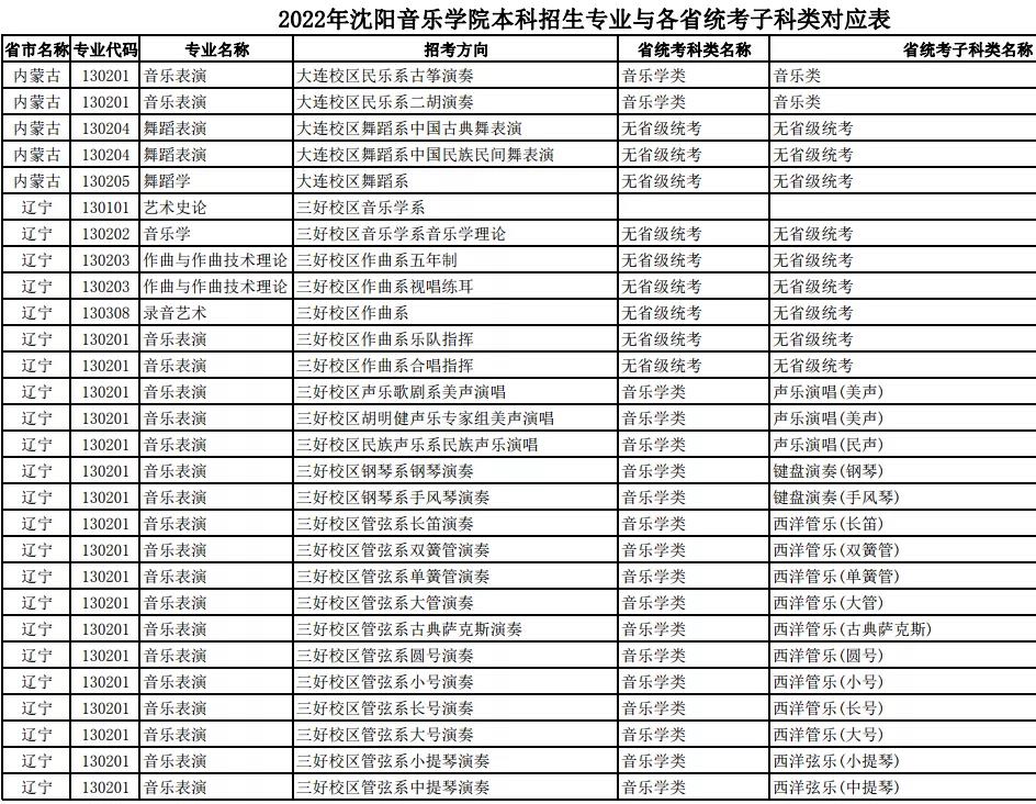校考 | 沈阳音乐学院2022年本科专业与各省统考子科类对应表