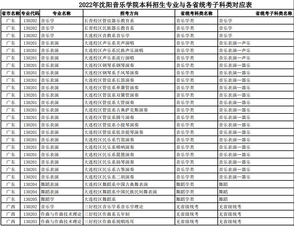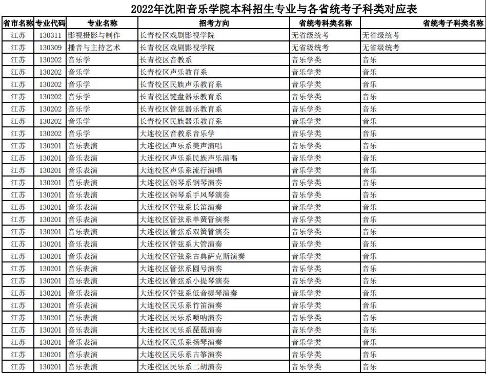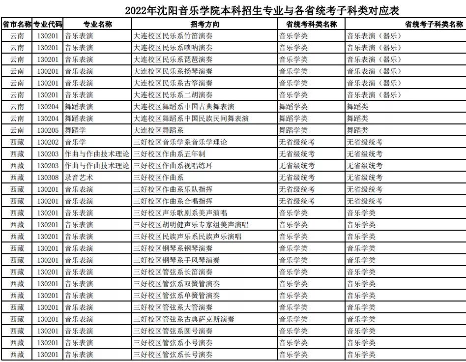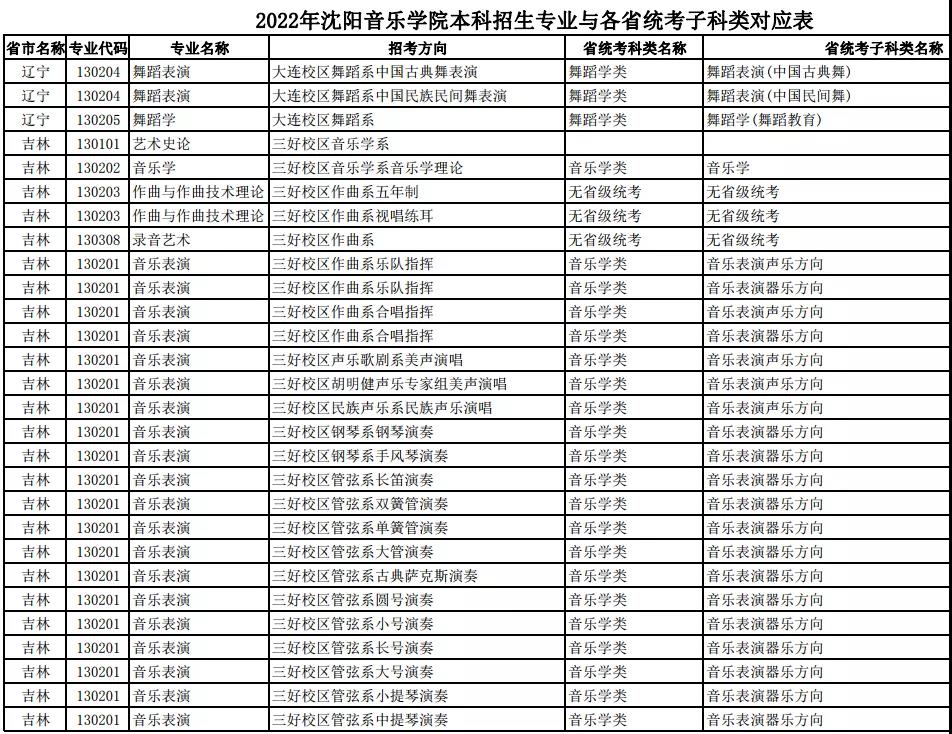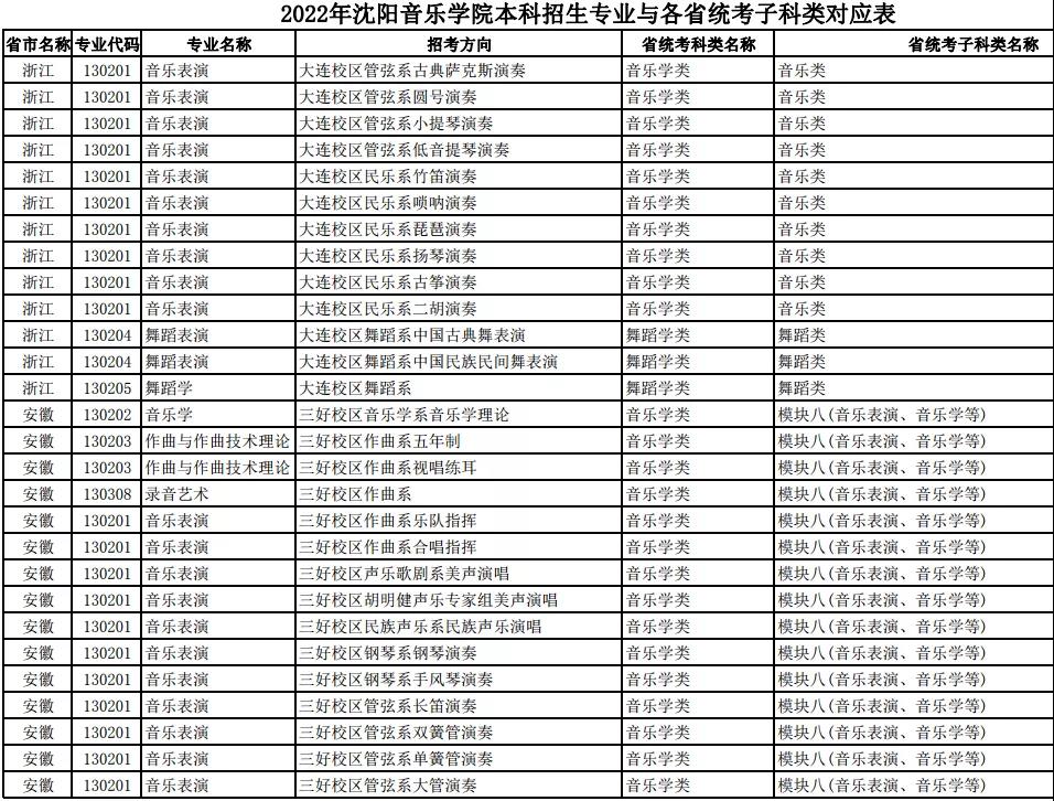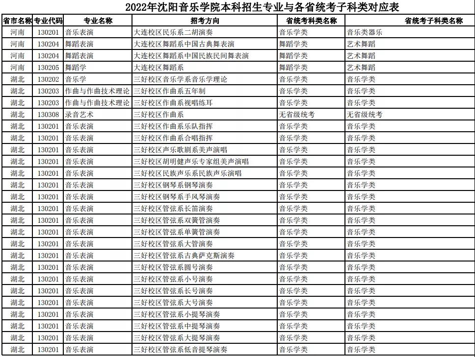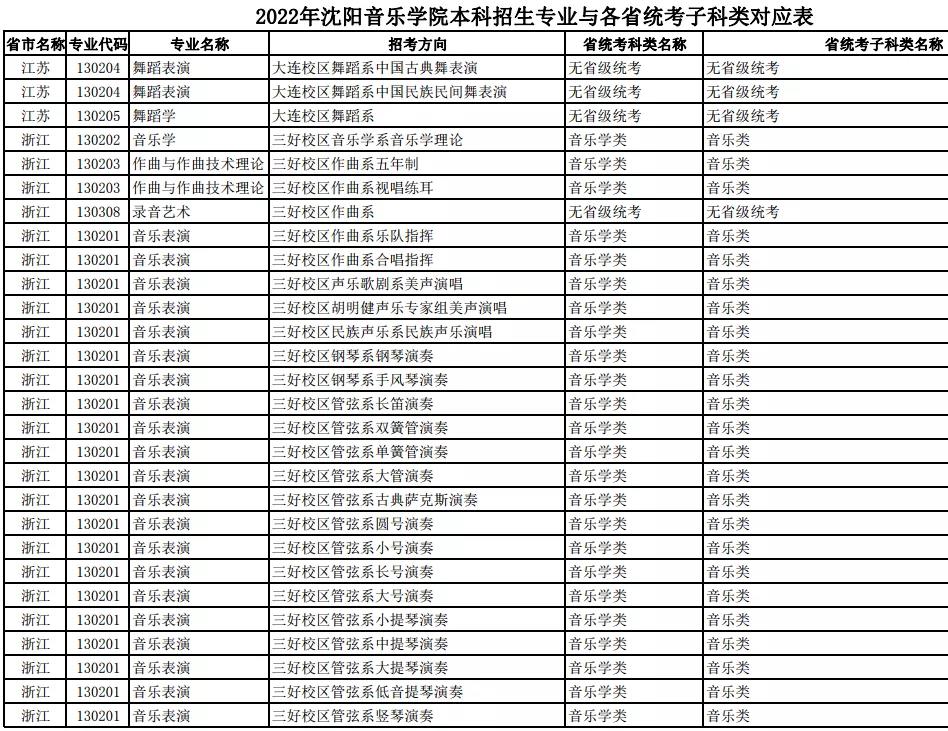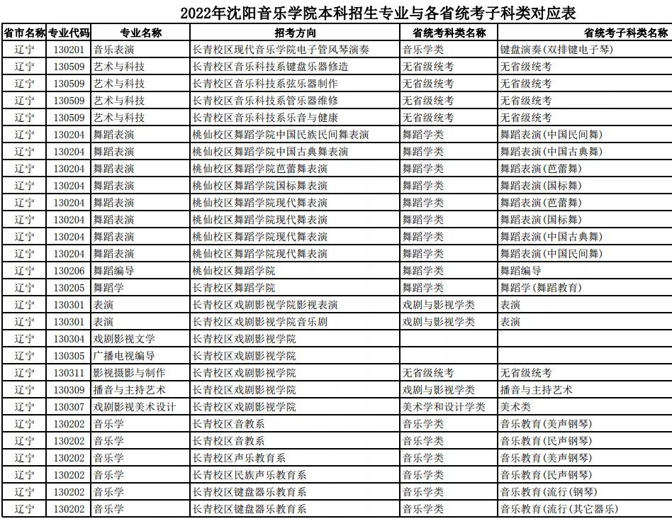校考 | 沈阳音乐学院2022年本科专业与各省统考子科类对应表