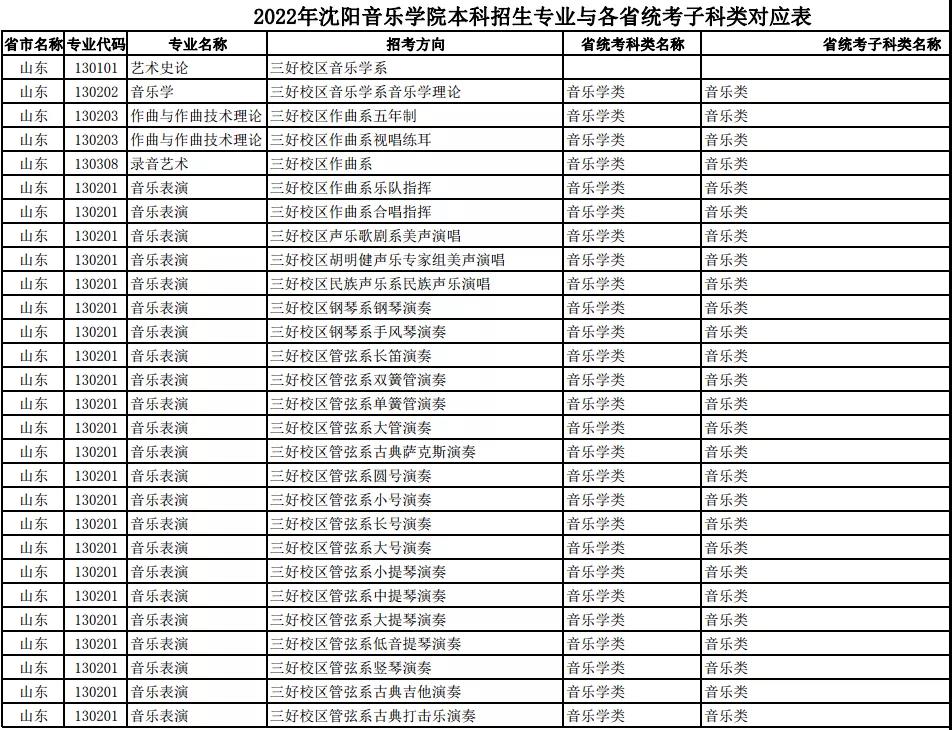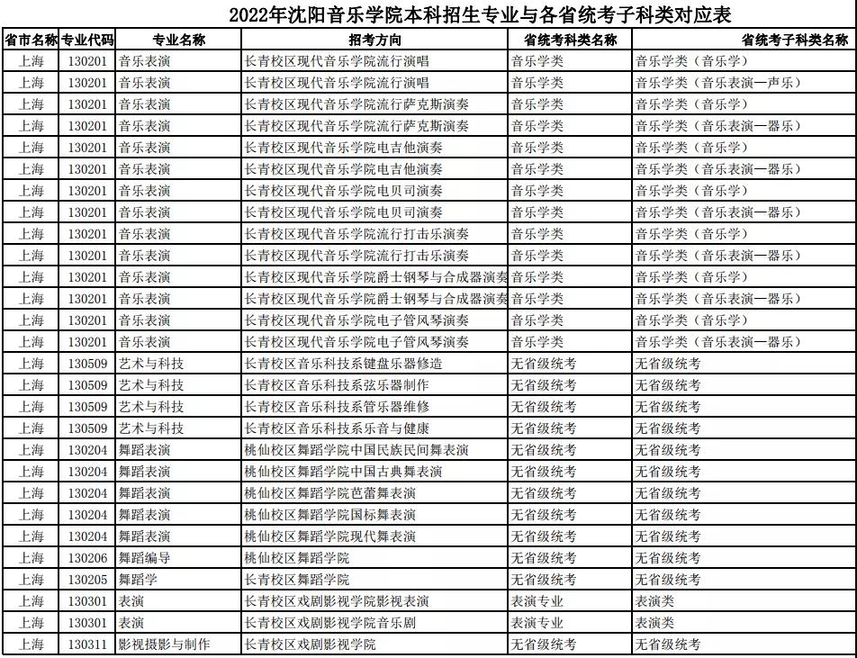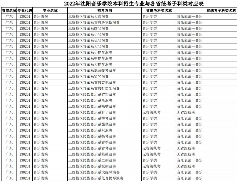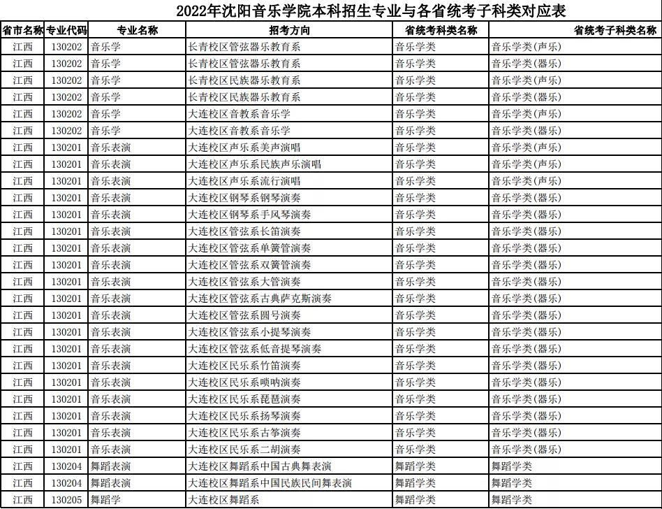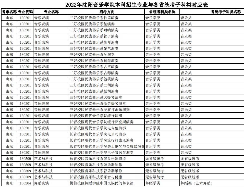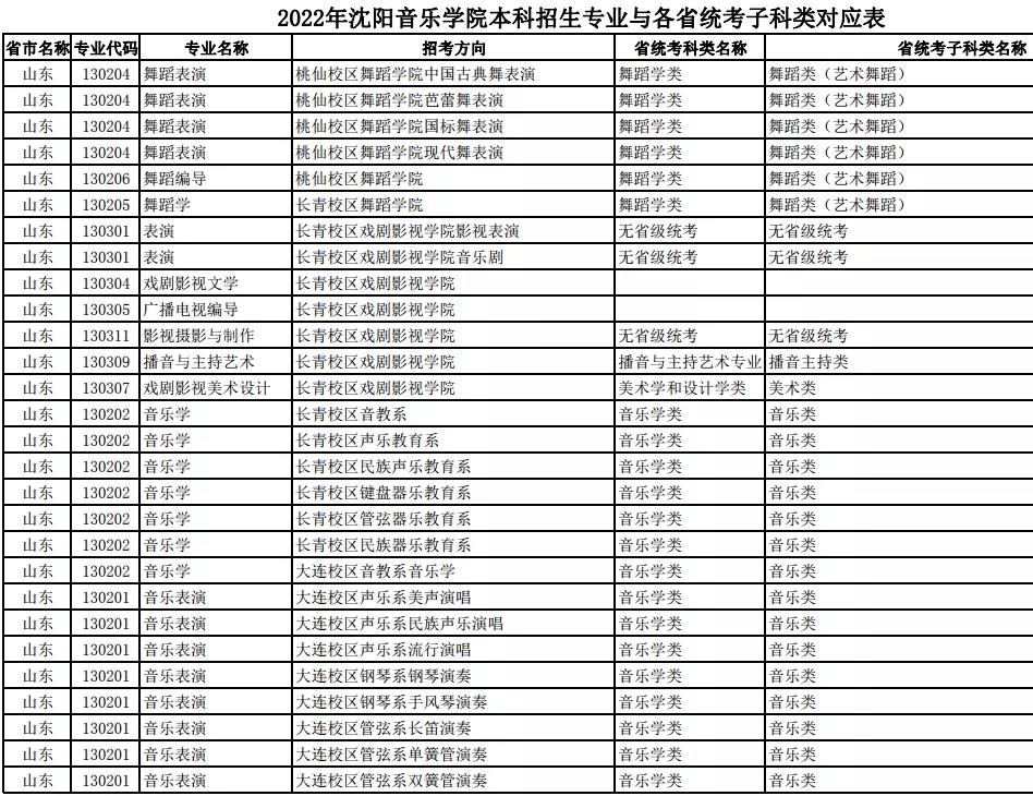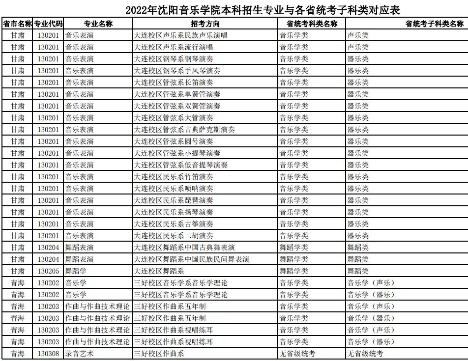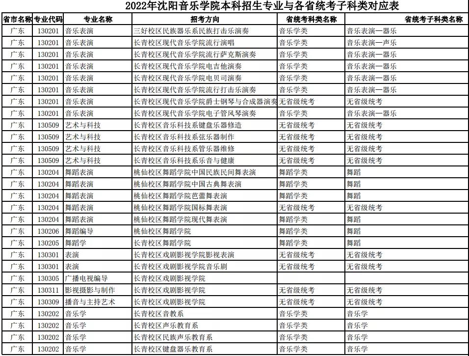 校考 | 沈阳音乐学院2022年本科专业与各省统考子科类对应表