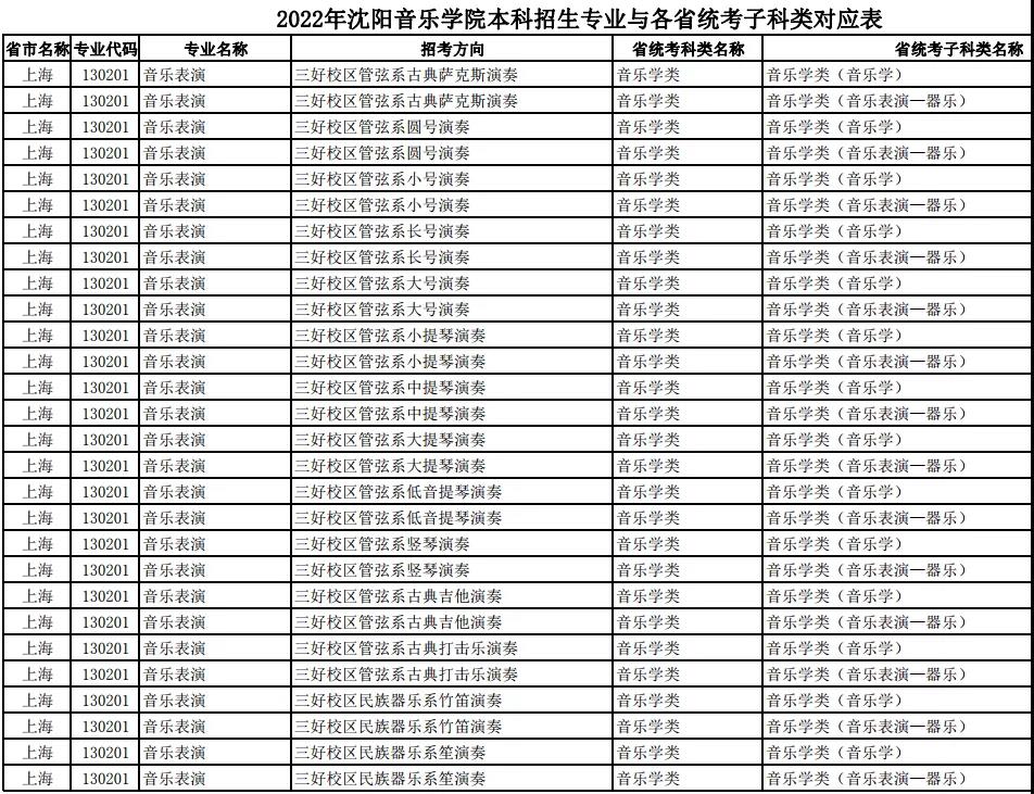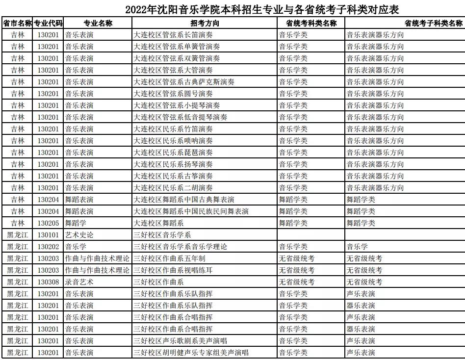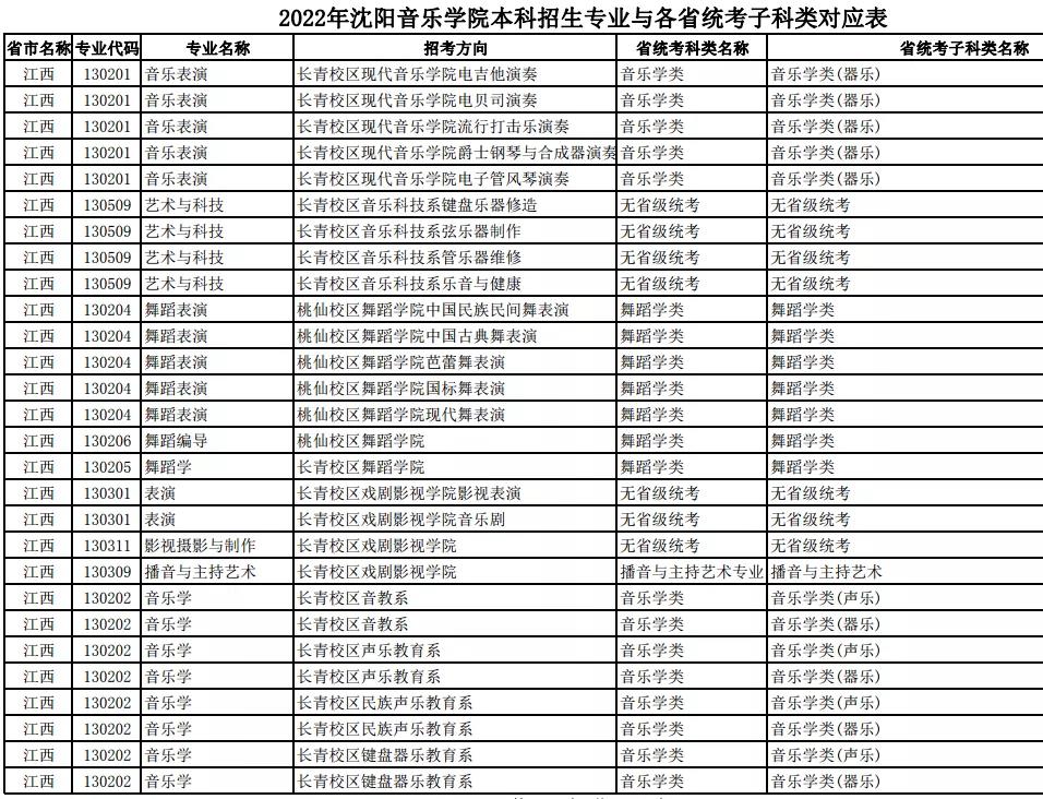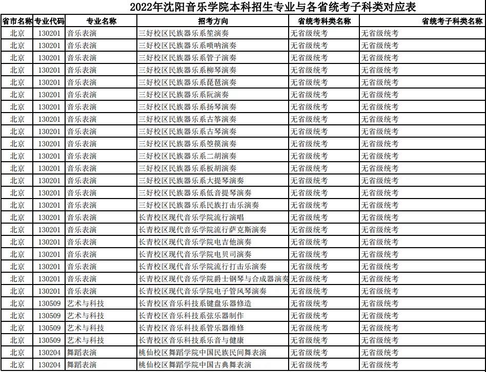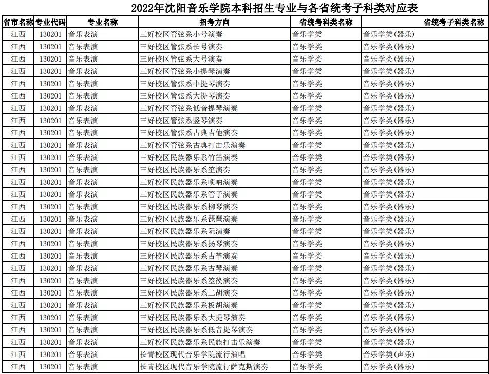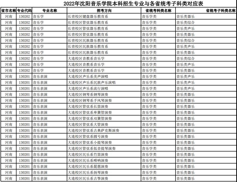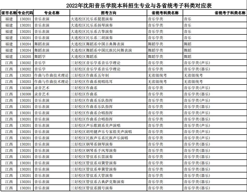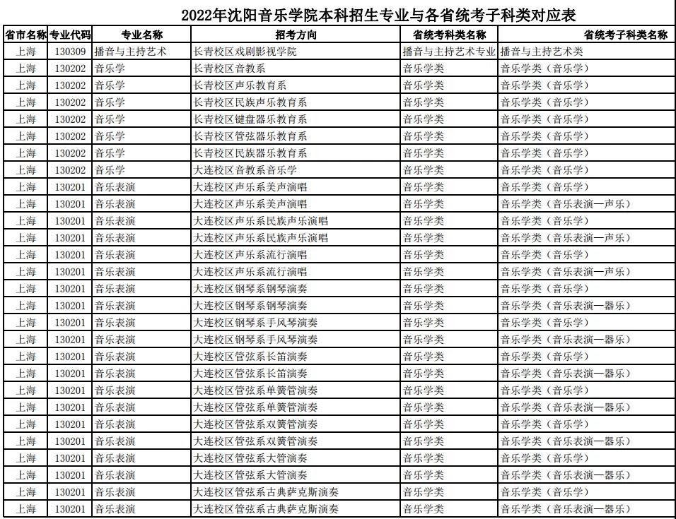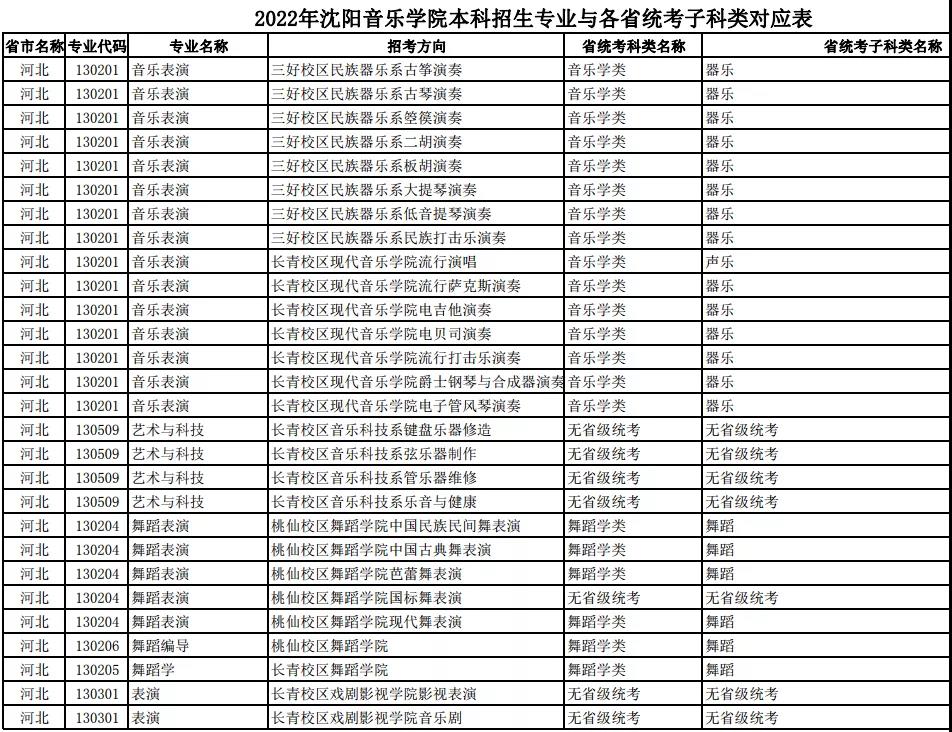 校考 | 沈阳音乐学院2022年本科专业与各省统考子科类对应表