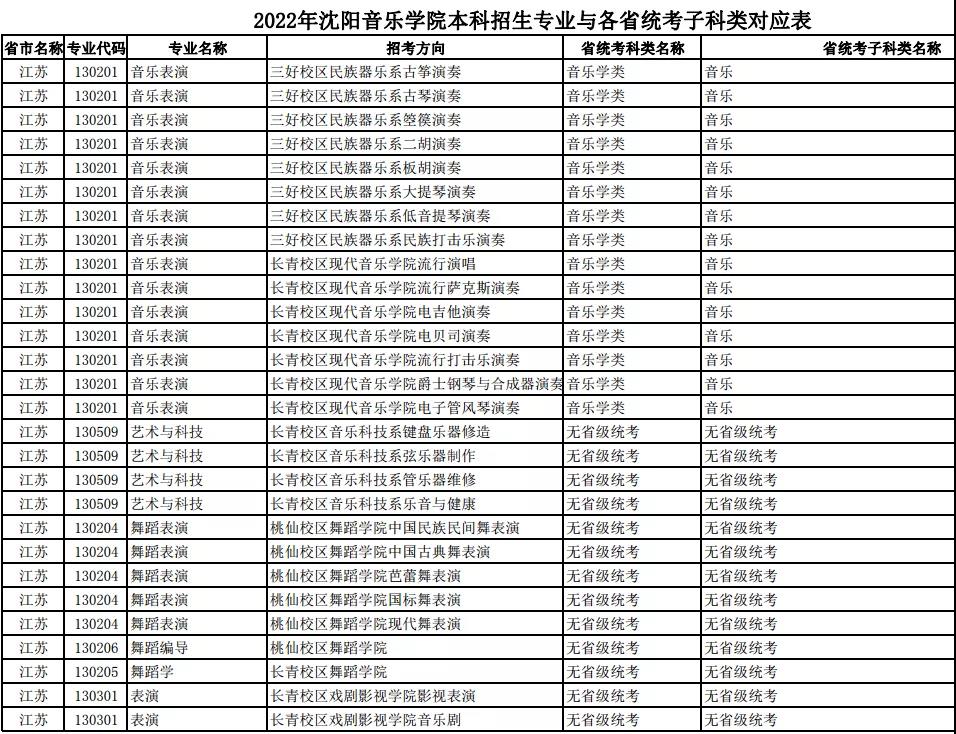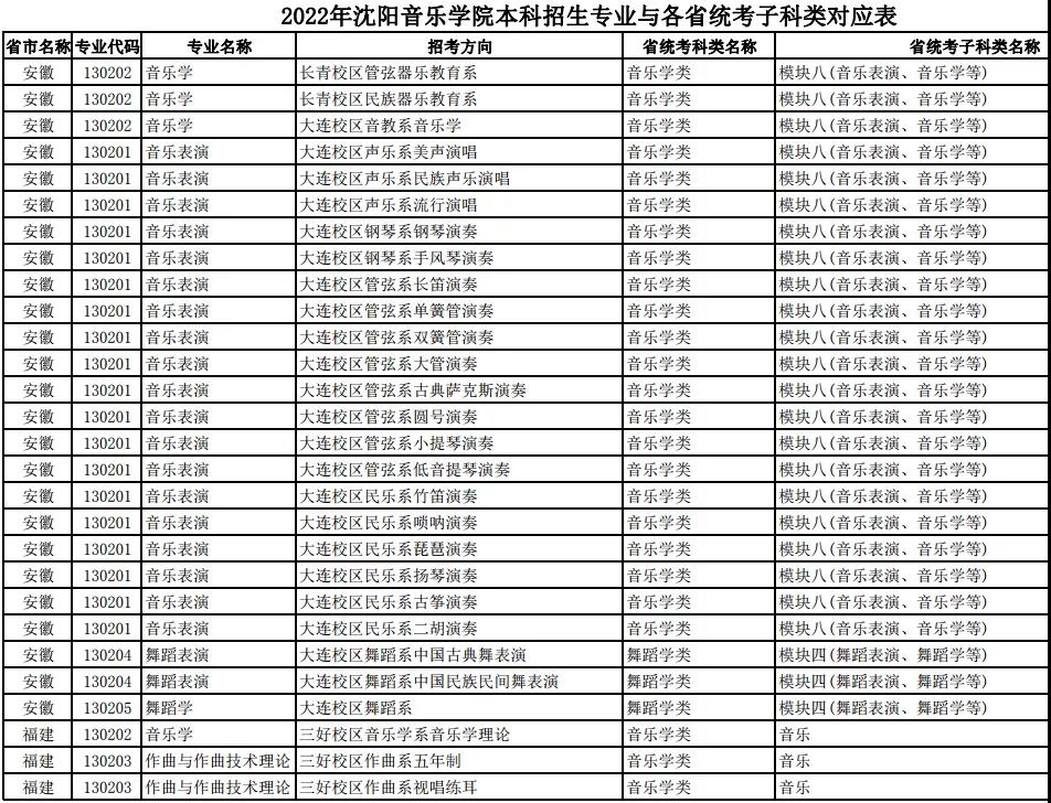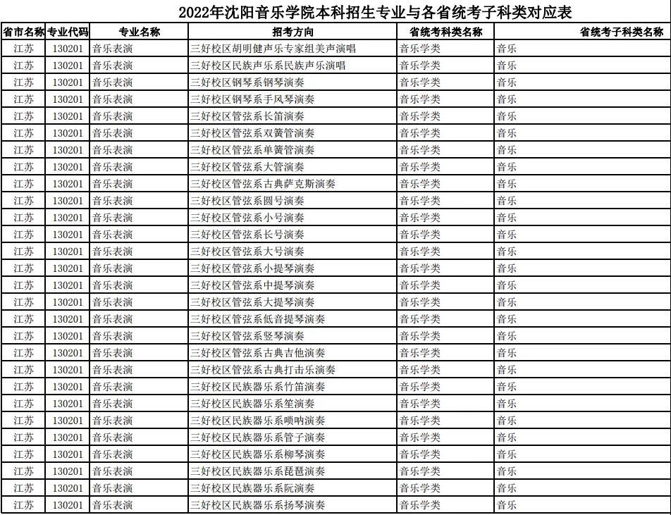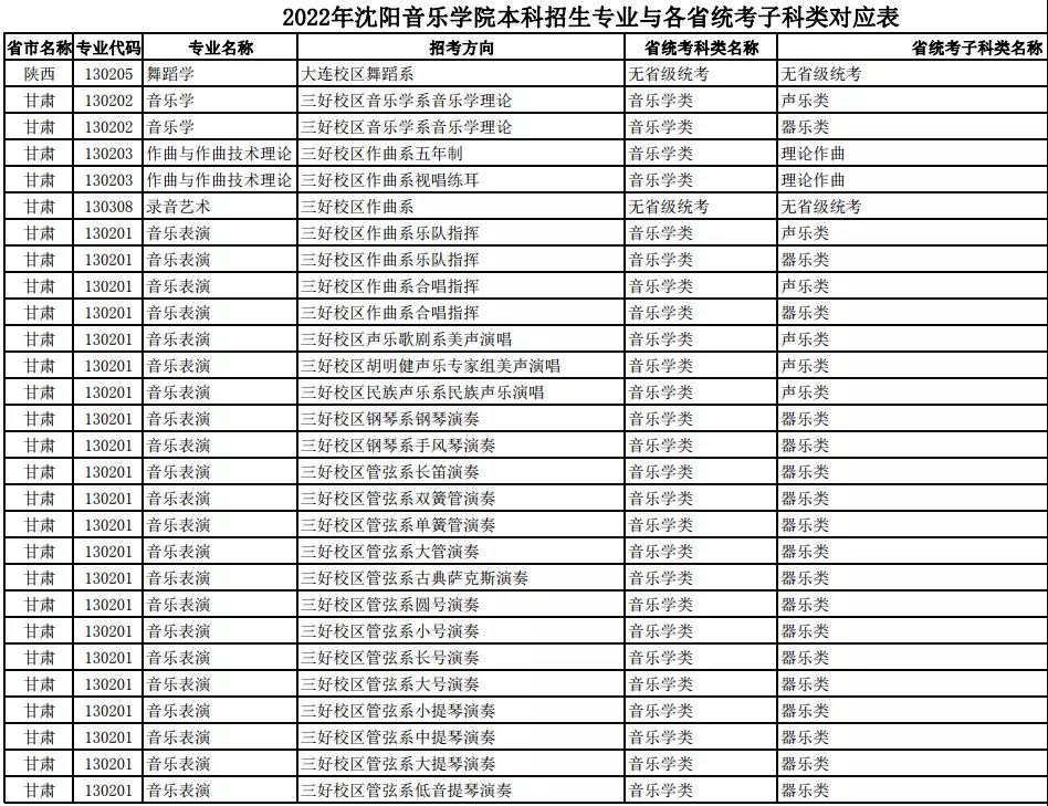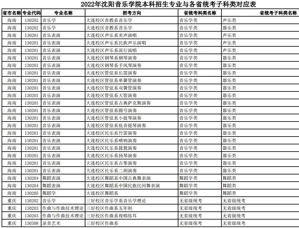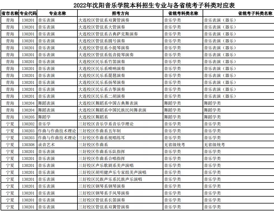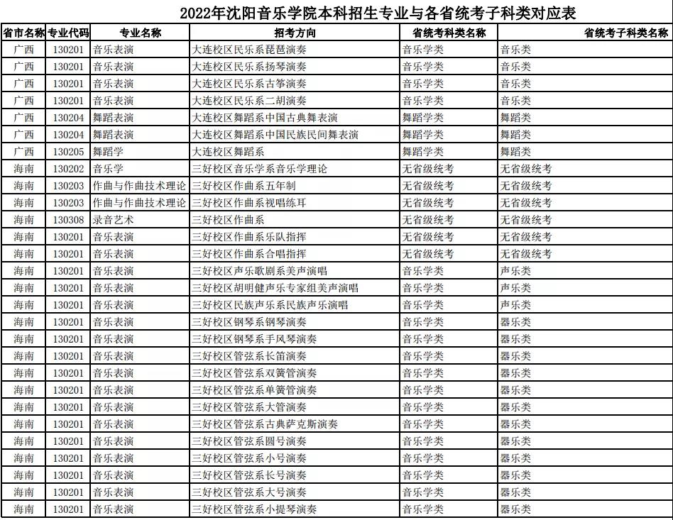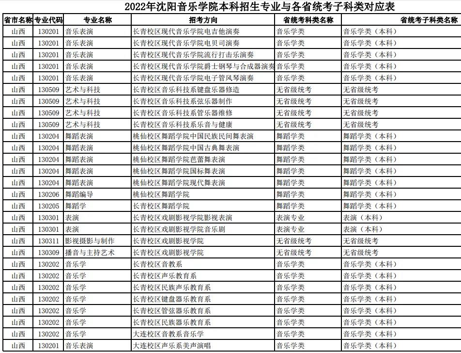 校考 | 沈阳音乐学院2022年本科专业与各省统考子科类对应表
