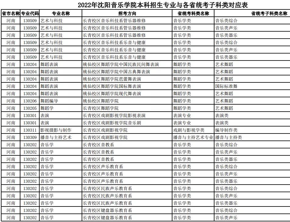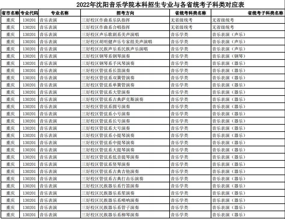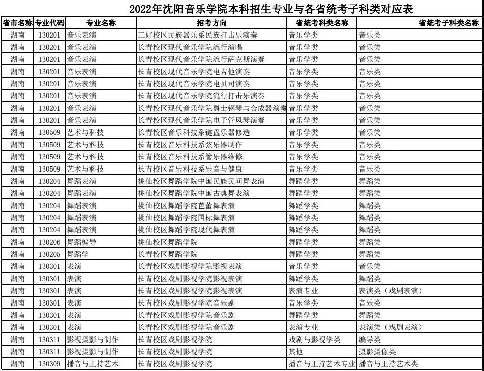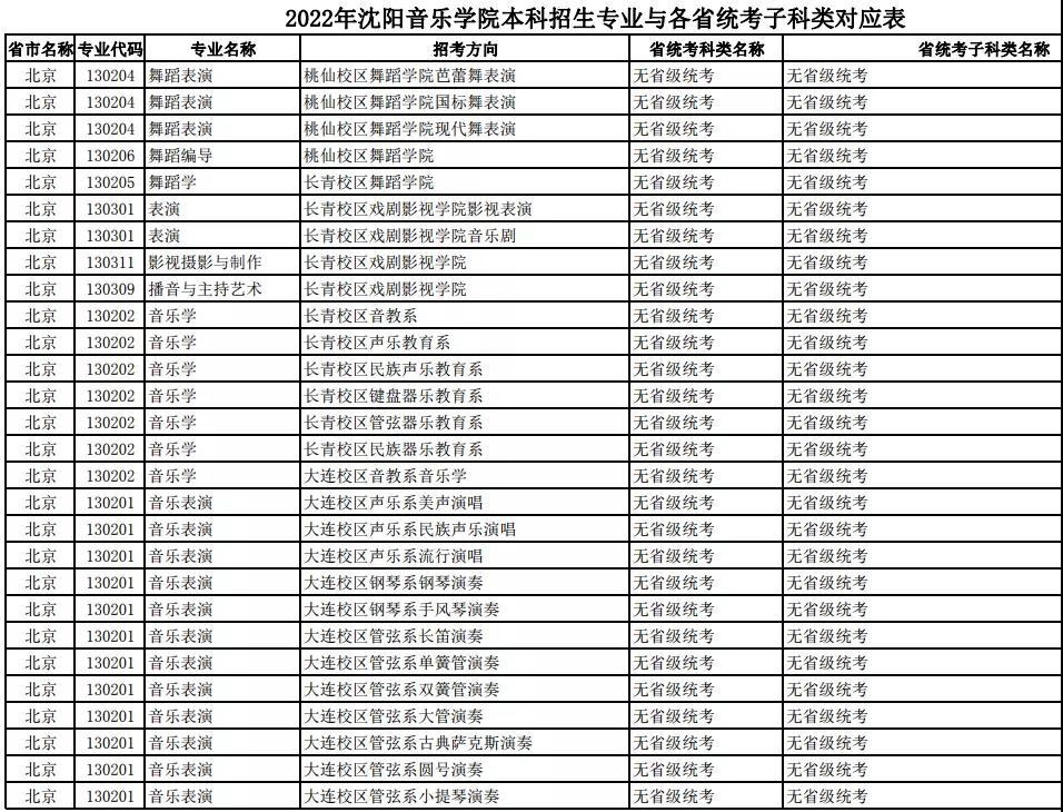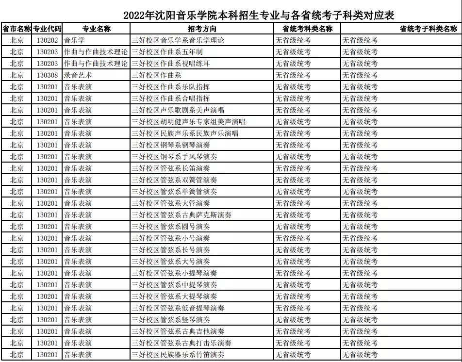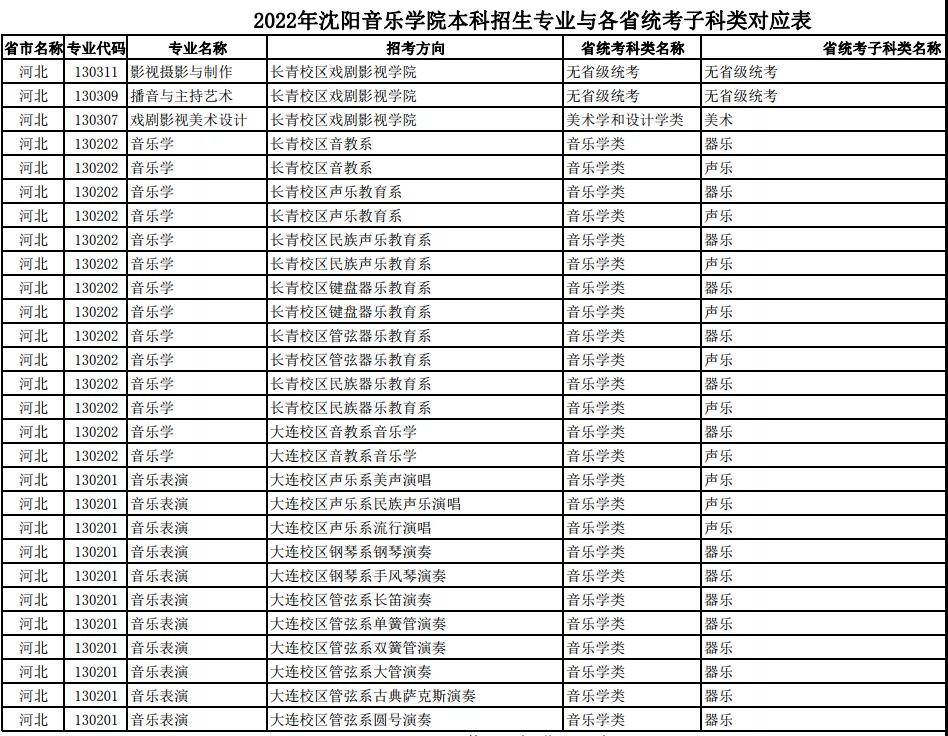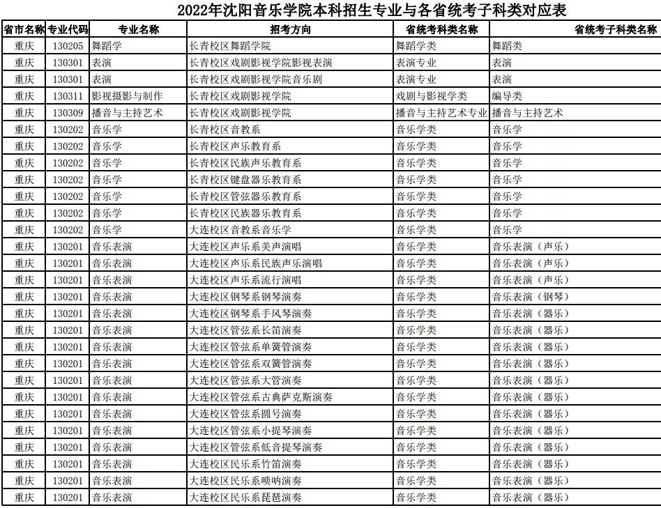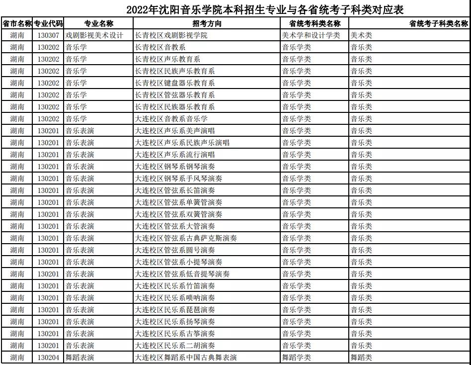 校考 | 沈阳音乐学院2022年本科专业与各省统考子科类对应表