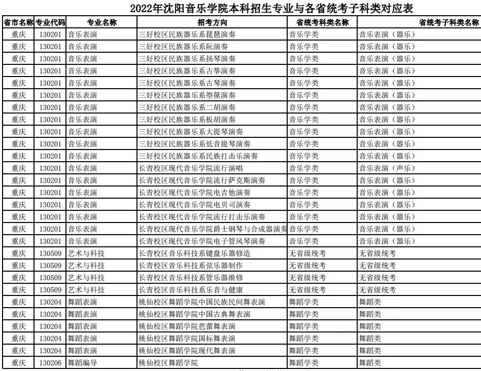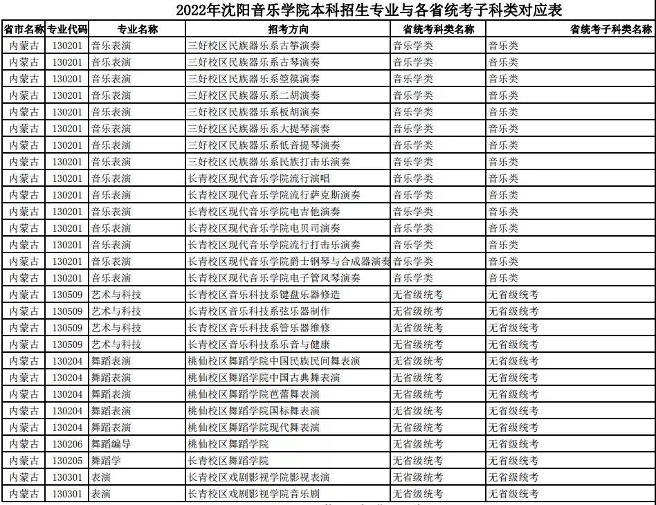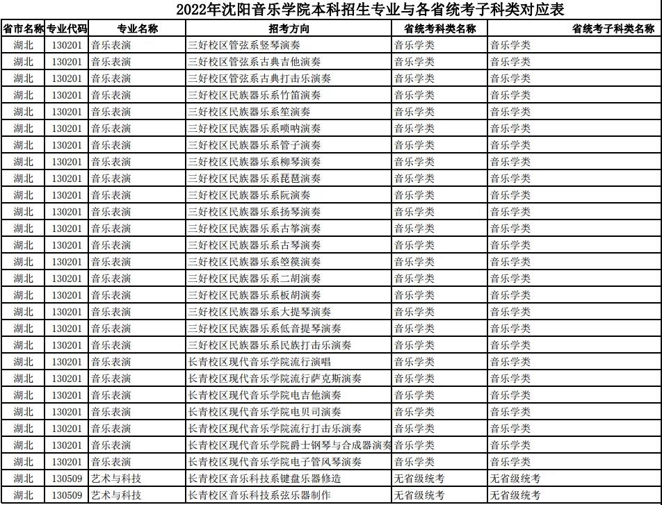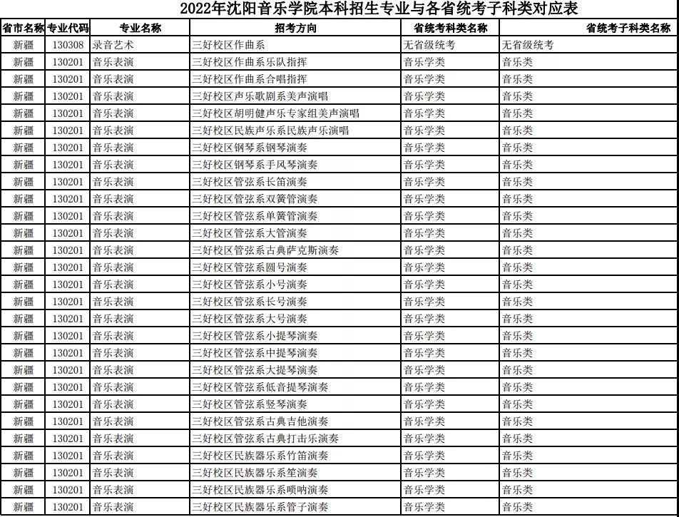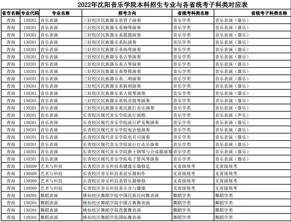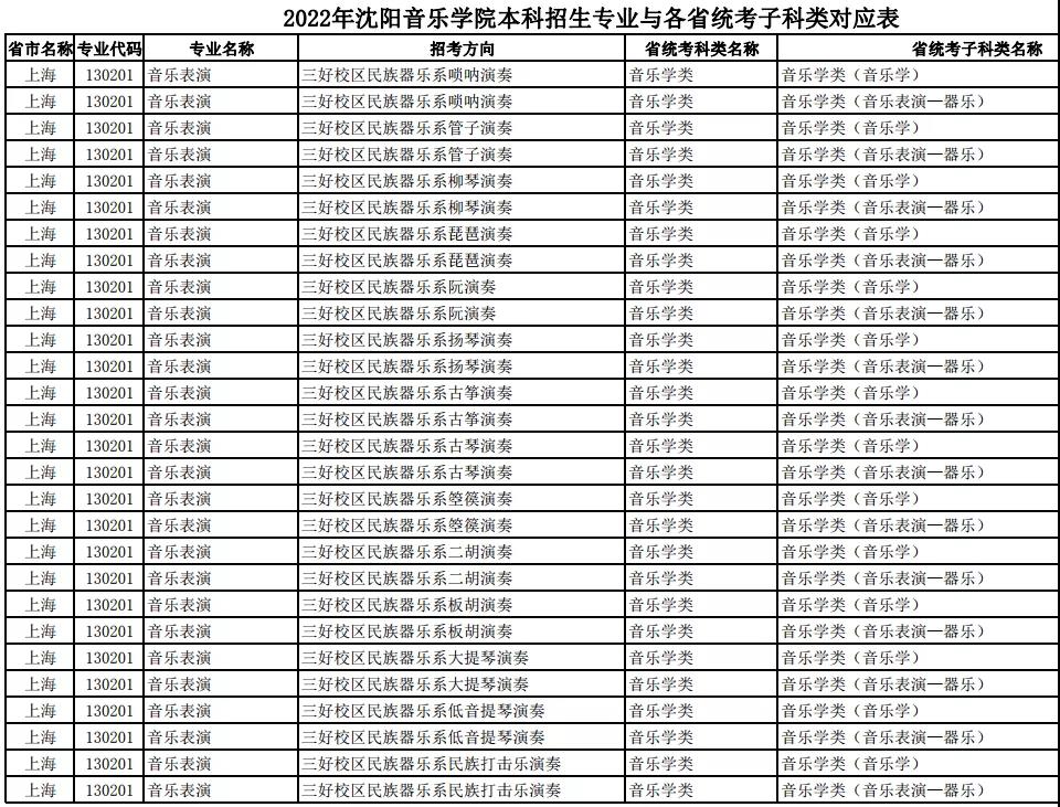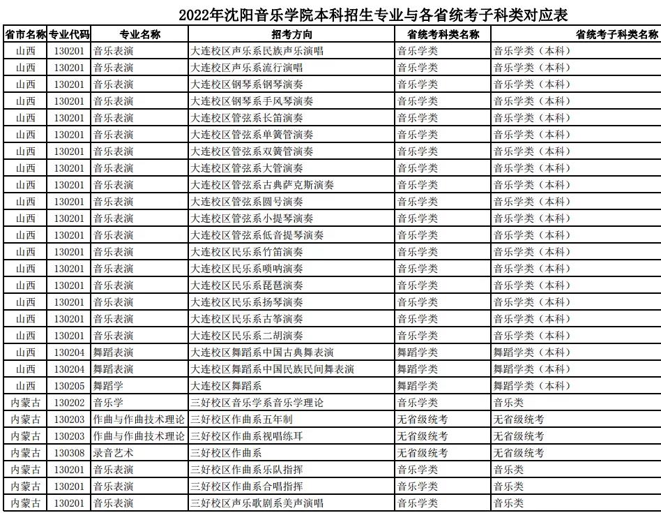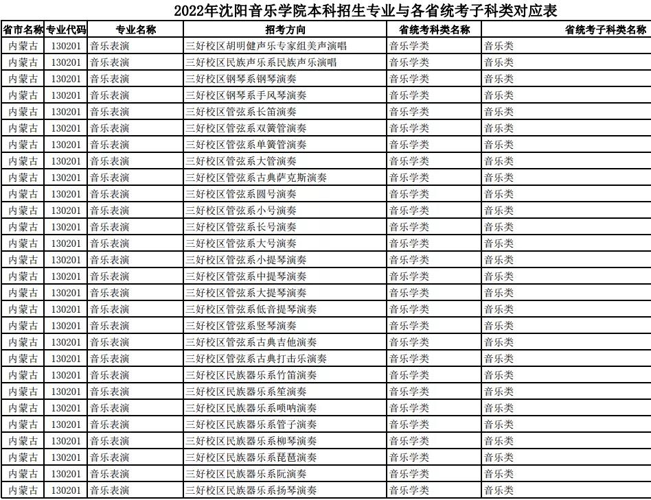 校考 | 沈阳音乐学院2022年本科专业与各省统考子科类对应表