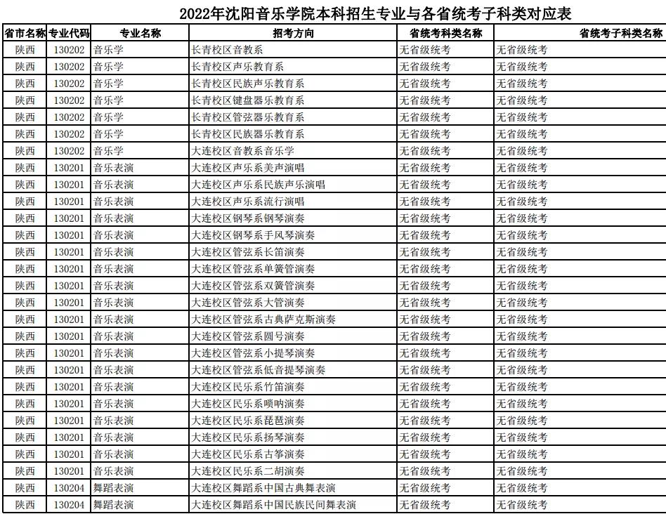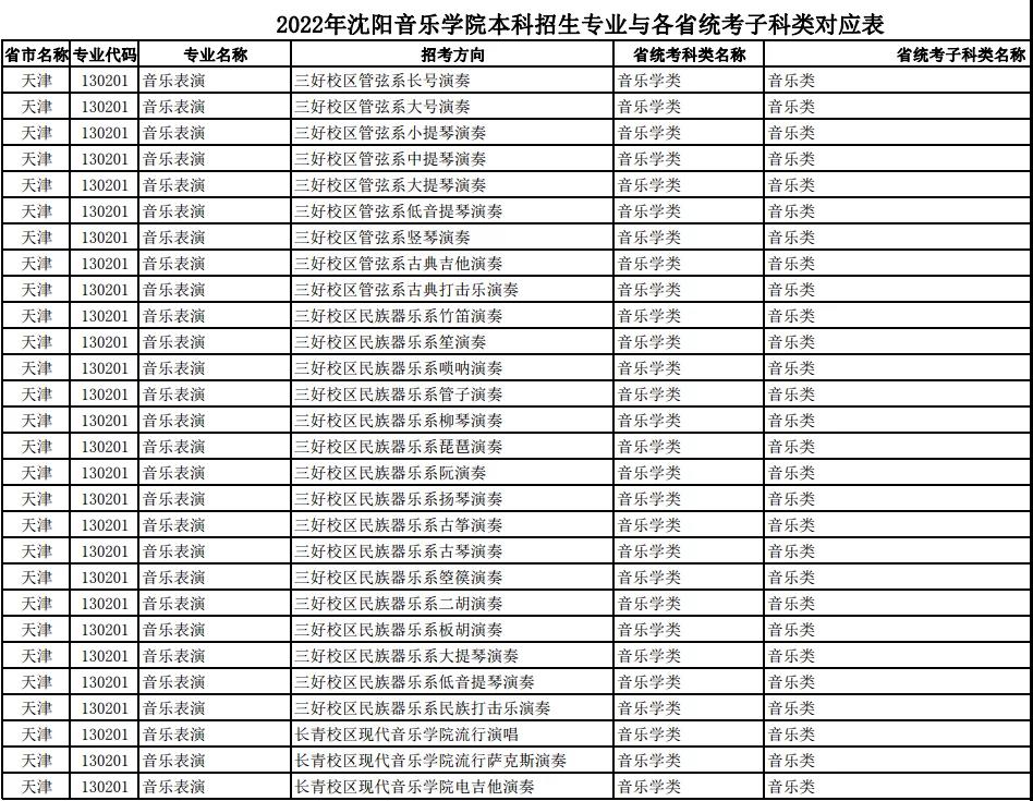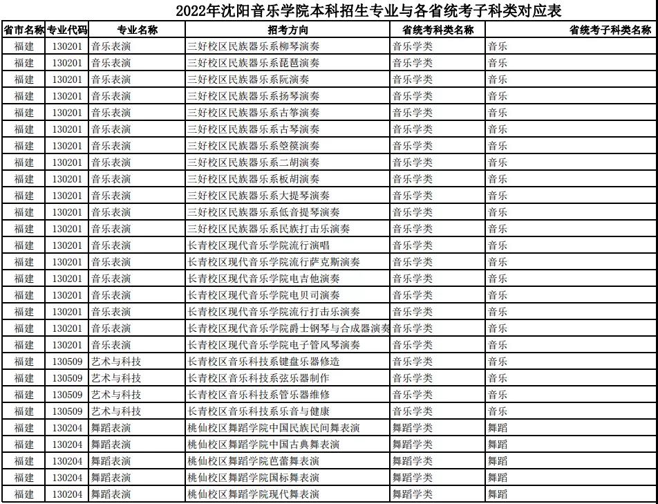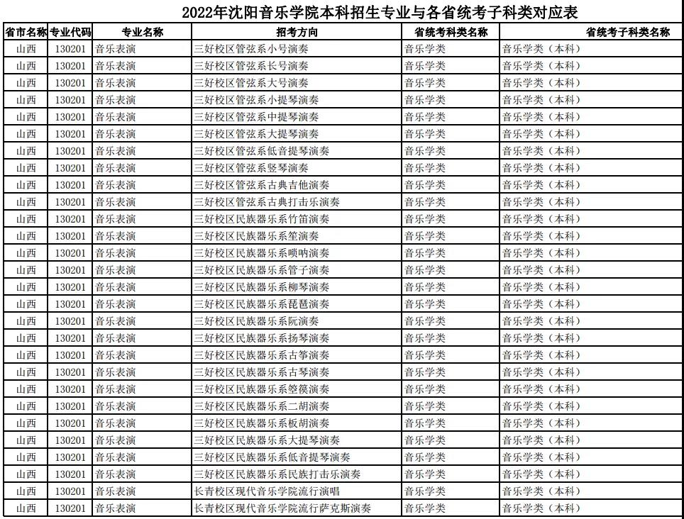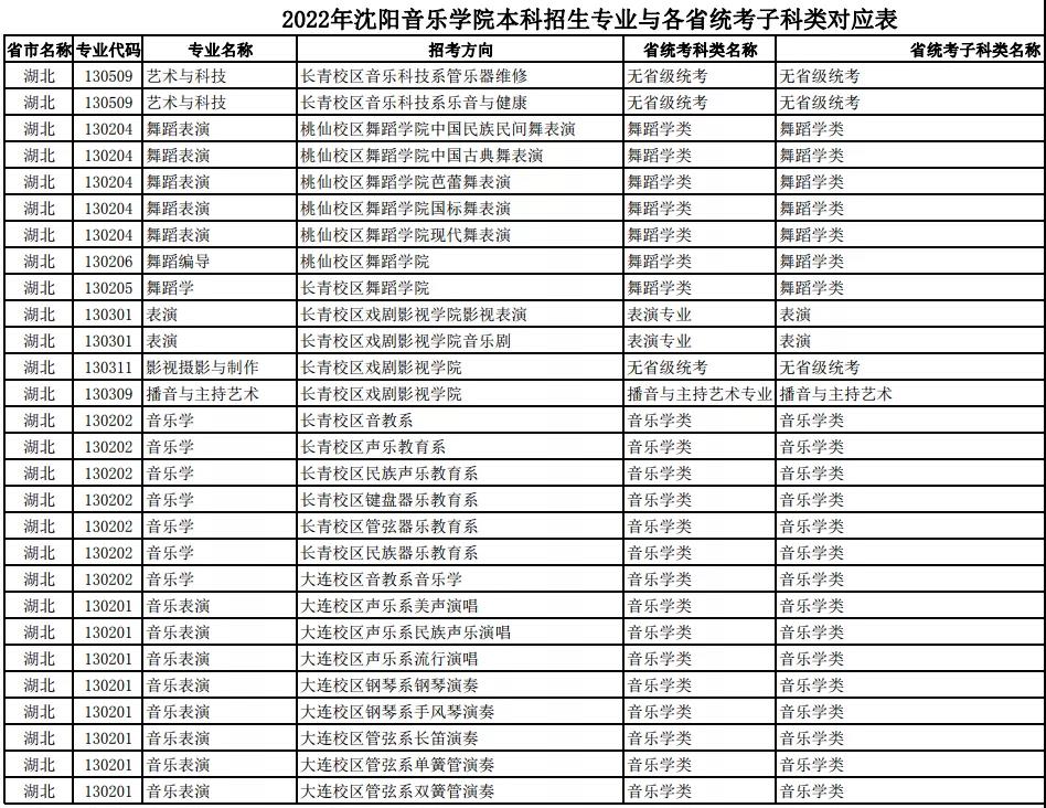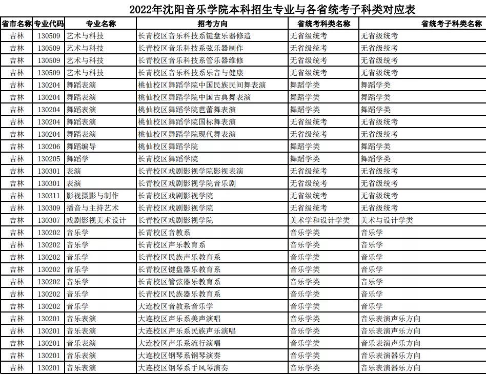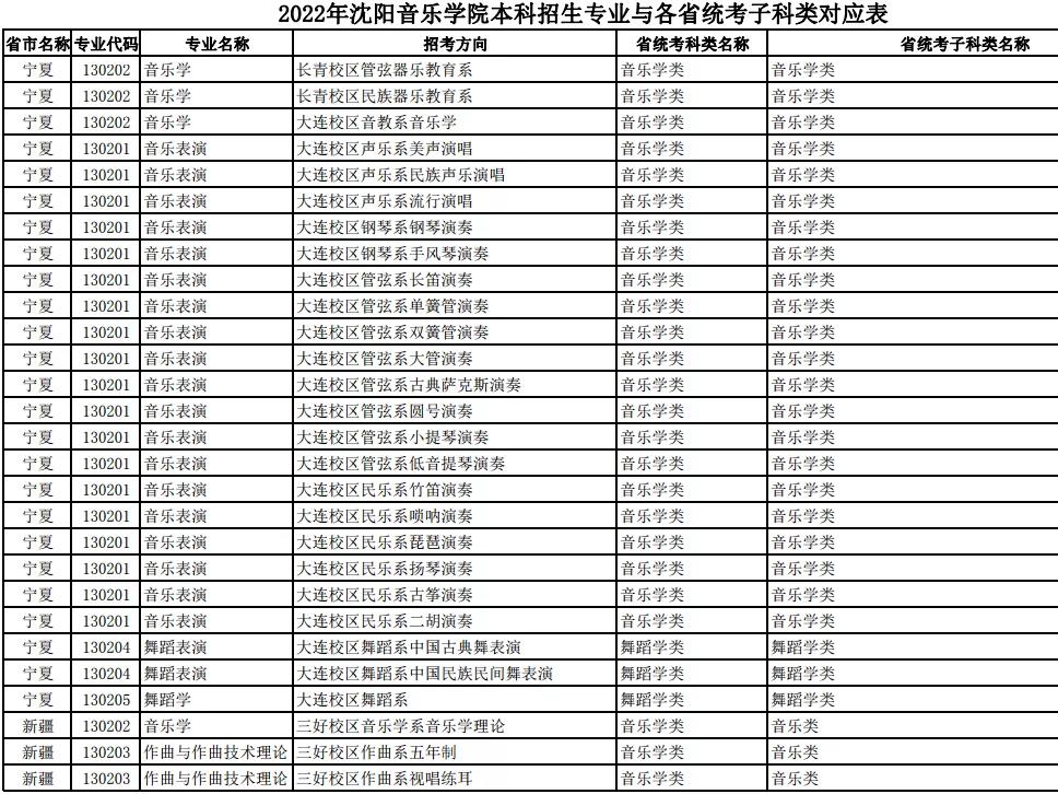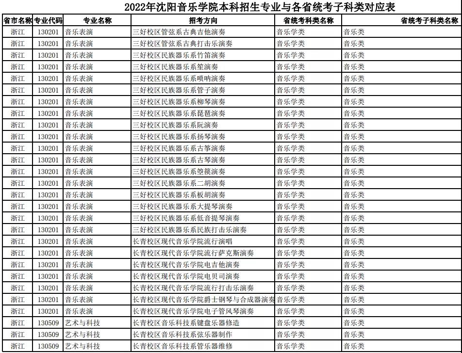 校考 | 沈阳音乐学院2022年本科专业与各省统考子科类对应表